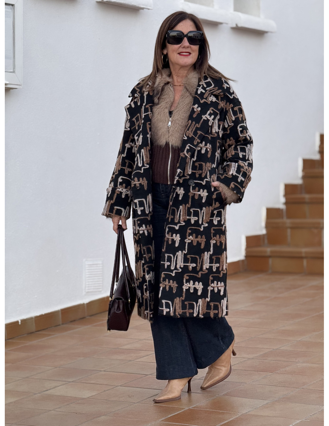 Abrigo negro con bordados en tonos marrón y camel, forrado interiormente para mayor confort y cierre con botón.