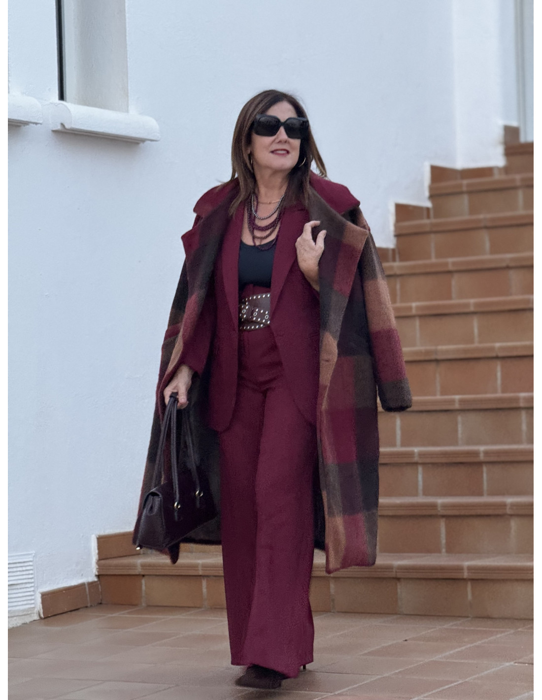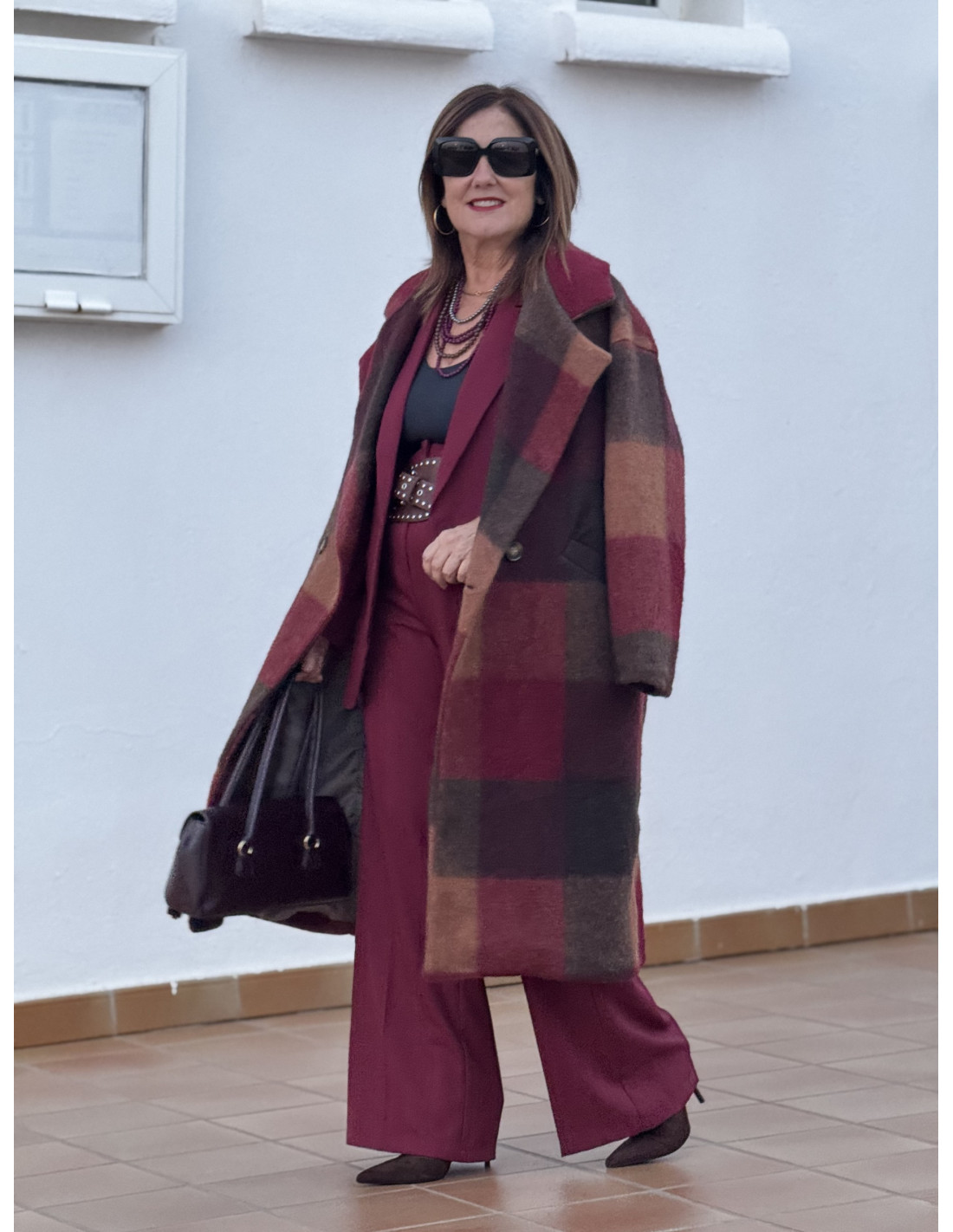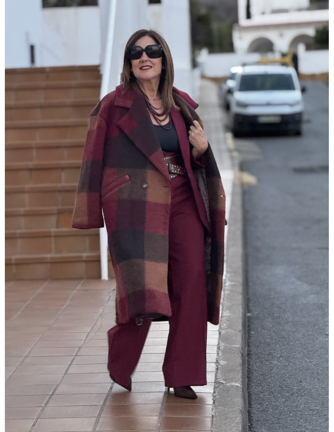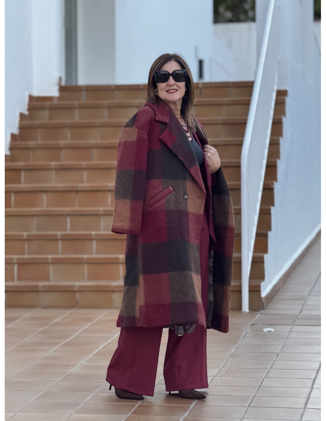 Abrigo cruzado a cuadros en tonos granates, completamente forrado y muy cálido. Su corte amplio y elegante lo hace perfecto para looks de invierno.