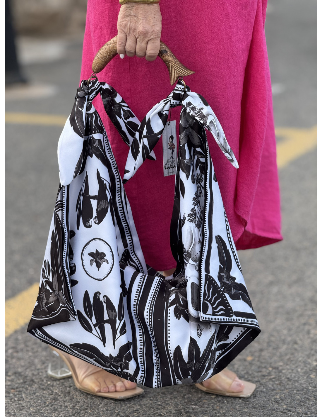 Este bolso pañuelo es una explosión de color y alegría. Con un estampado en blanco y negro lleno de loros, vegetación y detalles exóticos, aporta ese toque original que eleva cualquier look. El tejido ligero tipo pañuelo le da una caída preciosa, y el asa de madera añade un aire artesanal y elegante.