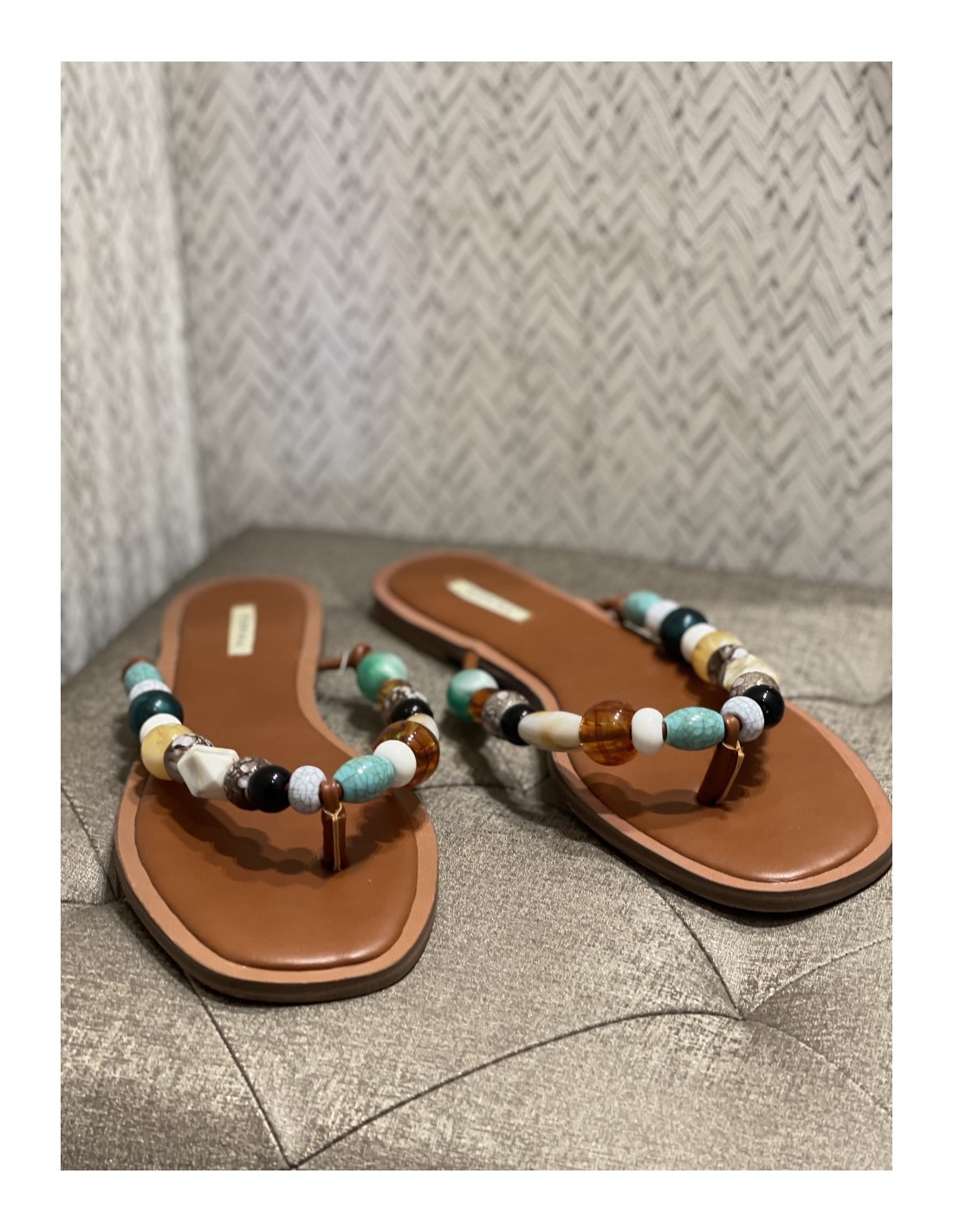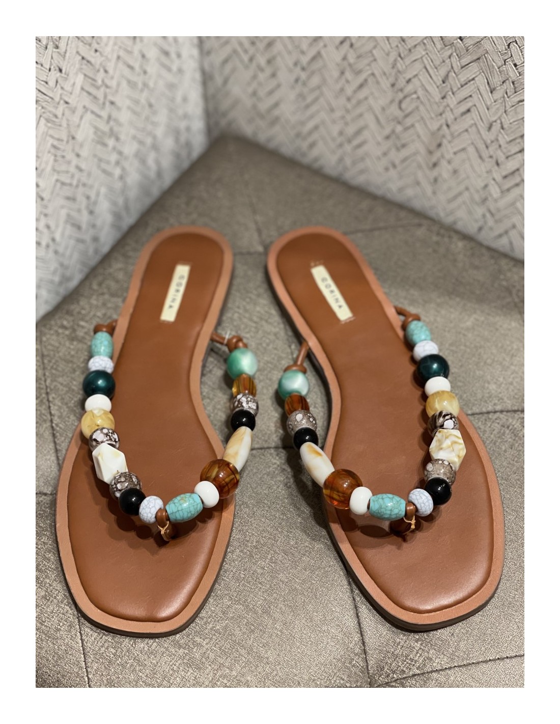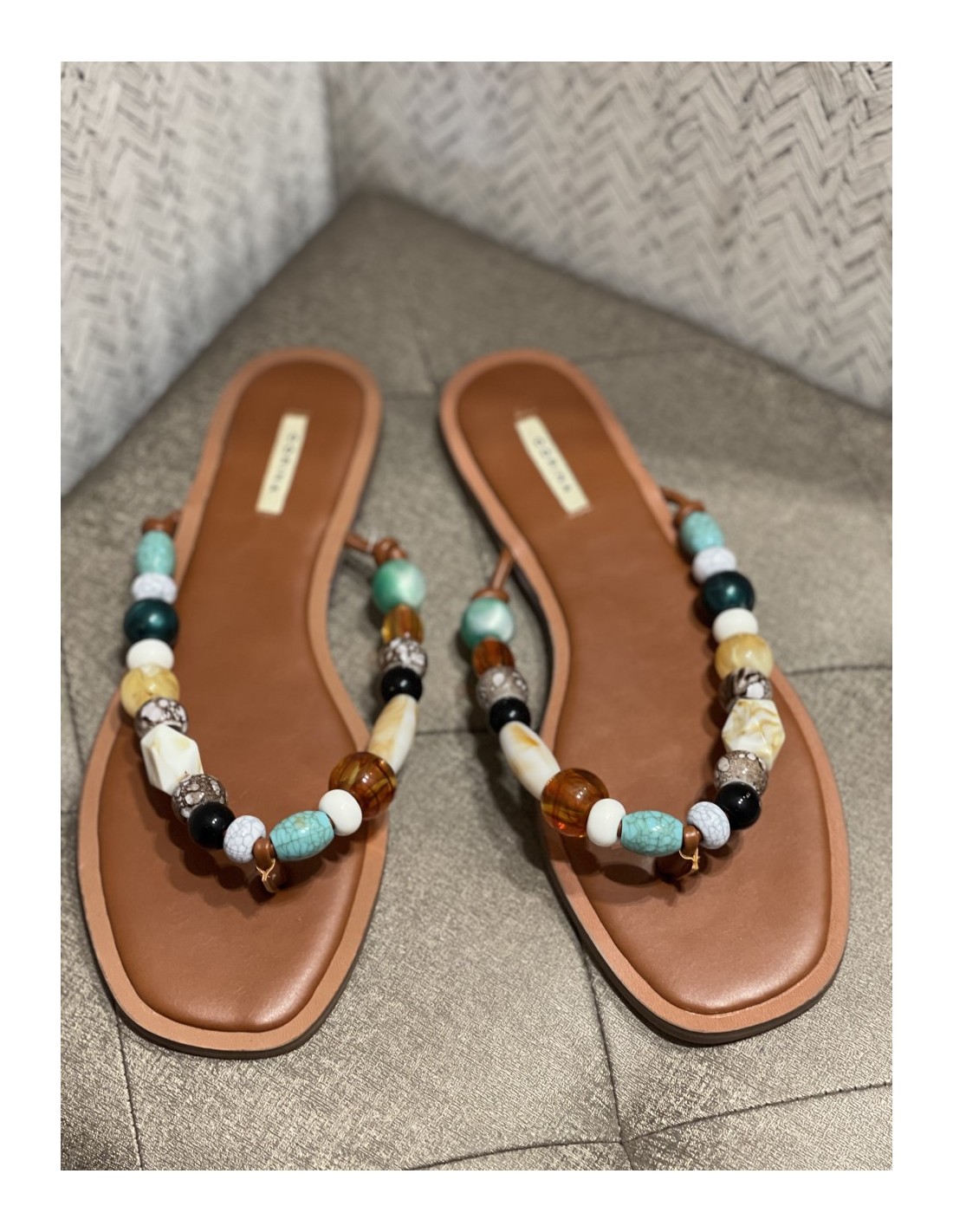 Sandalia plana con tiras y adornos. Con forro y plantilla acolchada. Composición sintético.
