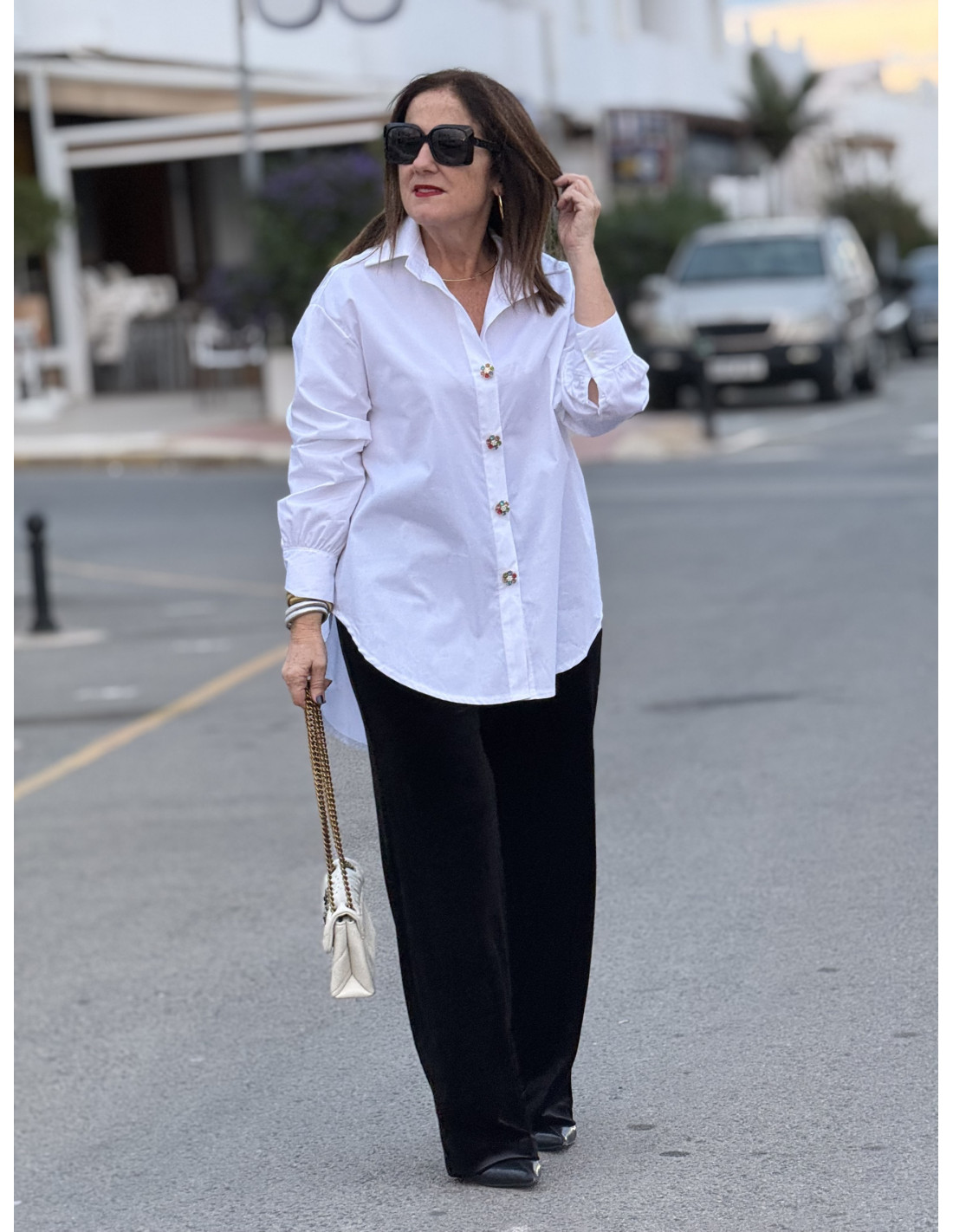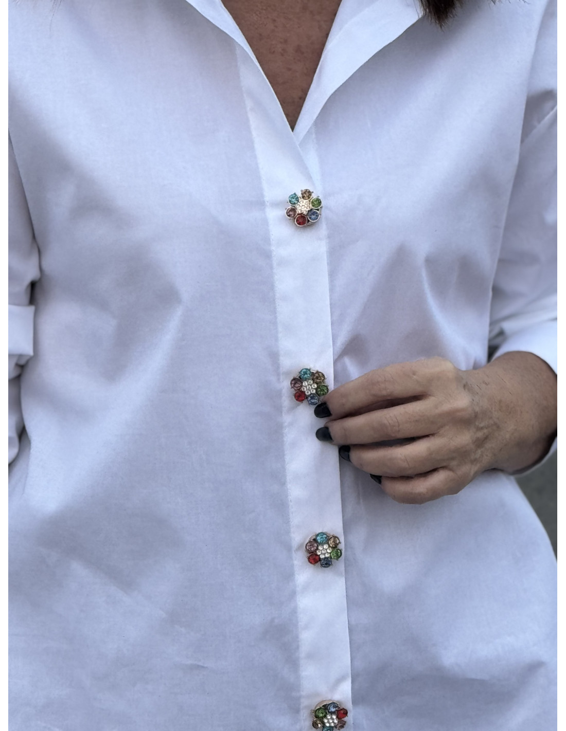 Camisa blanca de diseño sofisticado y atemporal, decorada con elegantes botones joya que aportan un toque distintivo. Es una prenda versátil que puedes llevar suelta como blusón para un estilo relajado, o metida por dentro para crear un efecto más entallado y estilizado.