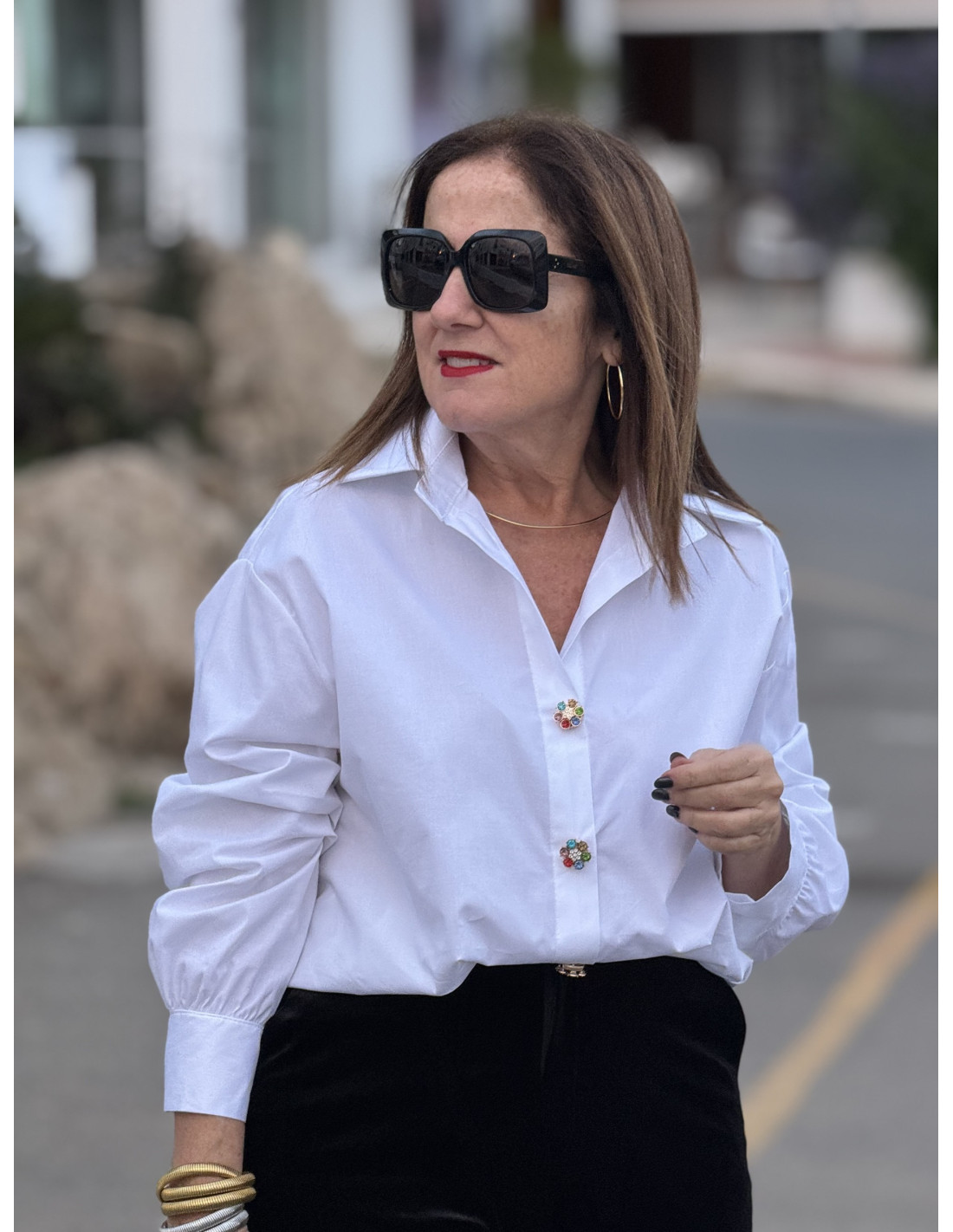 Camisa blanca con botones joya, diseño versátil para usar como blusón suelto o entallada.