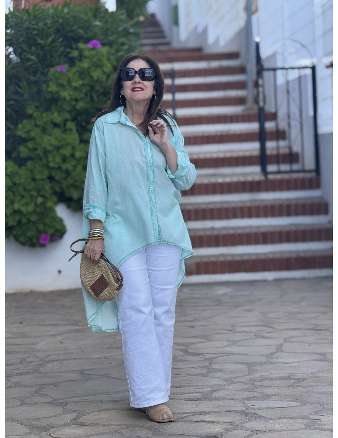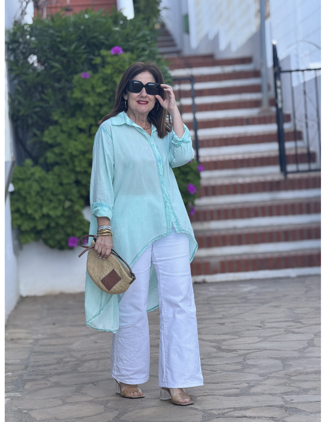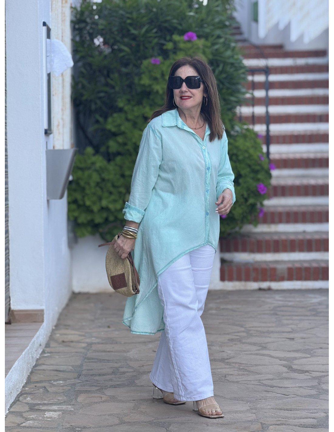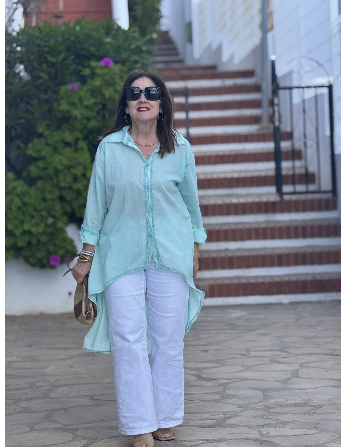 Camisa asimétrica en un precioso agua marina efecto lavado. Su tejido de algodón suave y fino la hace ideal para cualquier ocasión.