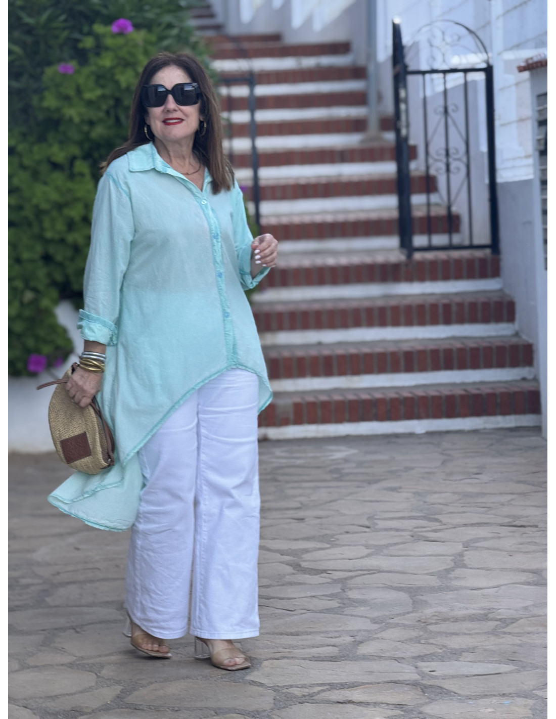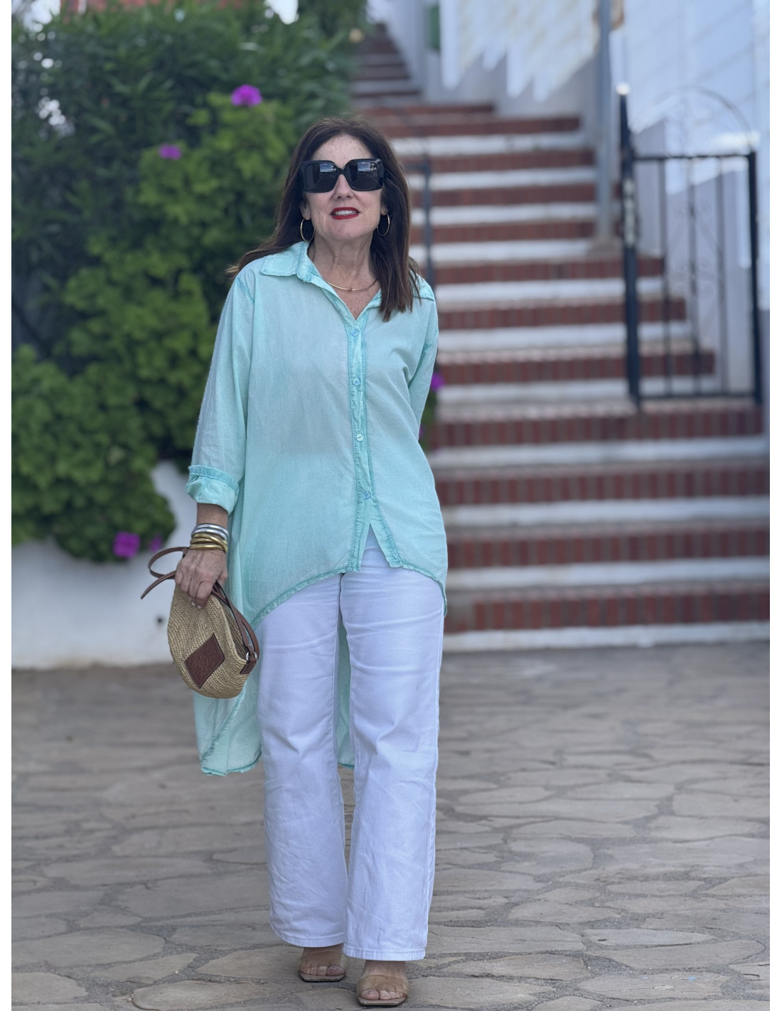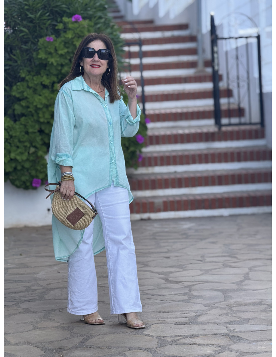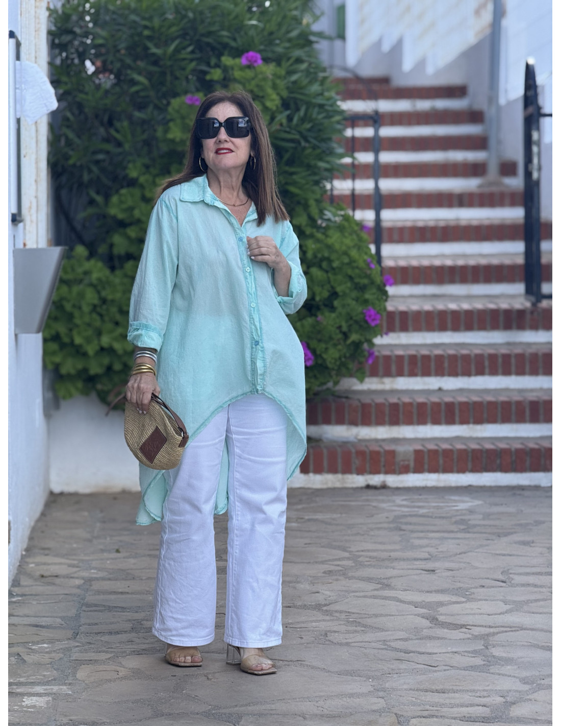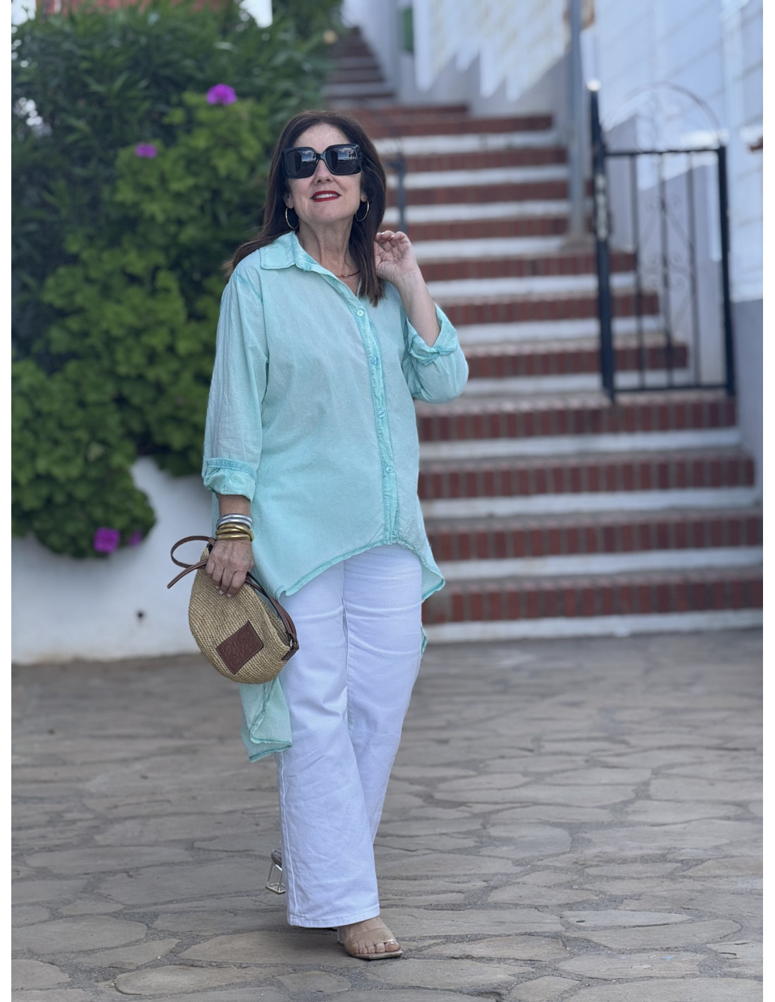 Camisa asimétrica en un precioso agua marina efecto lavado. Su tejido de algodón suave y fino la hace ideal para cualquier ocasión.