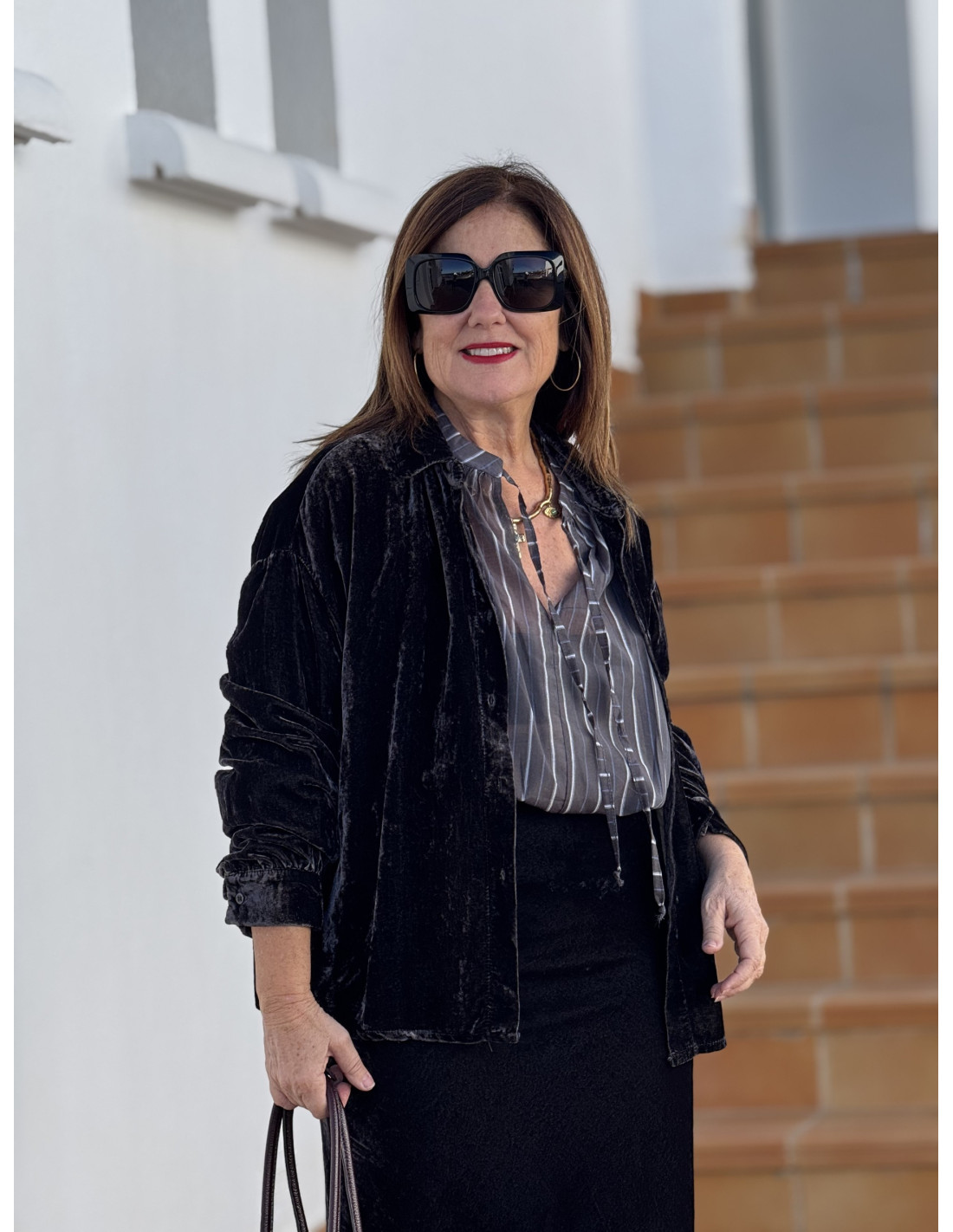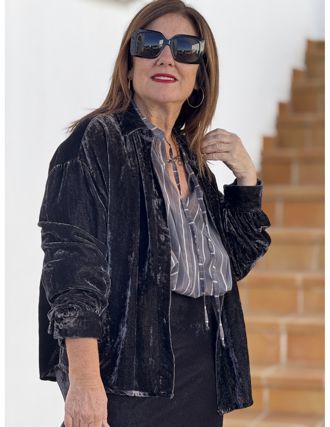 Camisa de terciopelo gris de tacto suave y acabado elegante. Se puede llevar como camisa o como sobrecamisa. Talla única muy favorecedora.