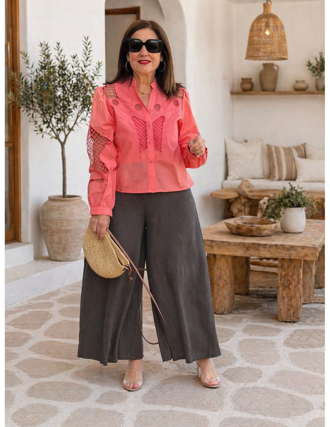 Camisa en color coral , combinada con bordado en el mismo tono y delicados calados en el frontal y las mangas, que aportan un acabado especial y muy femenino.