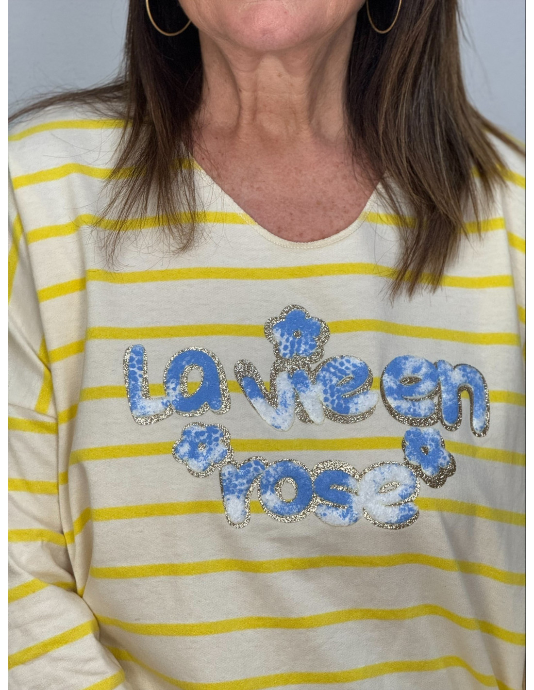 Camiseta de punto fino en tono amarillo con franjas blancas y amarillas que aportan un estilo fresco, luminoso y muy fácil de combinar. En el frontal destaca la frase “Lemon Rose” en color celeste, un detalle que aporta un toque alegre y original a la prenda.