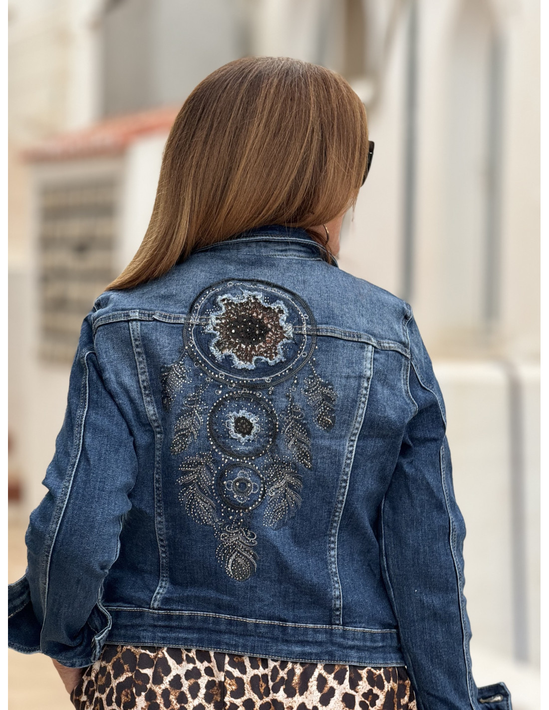 Cazadora vaquera con atrapasueños bordado en la espalda.