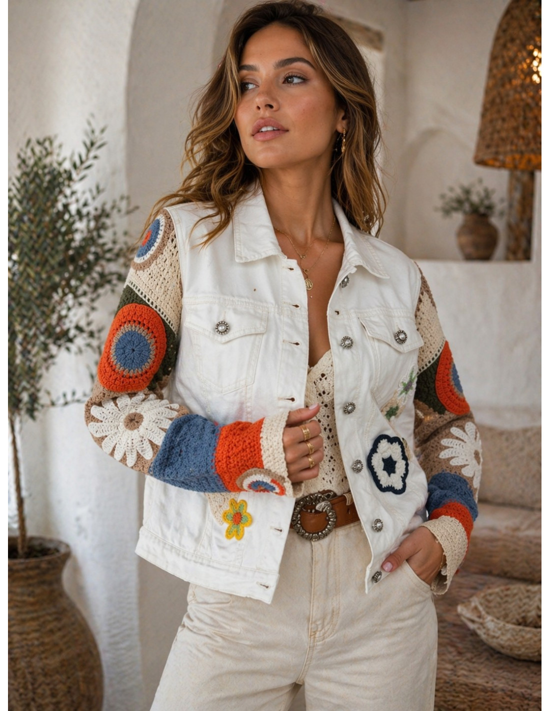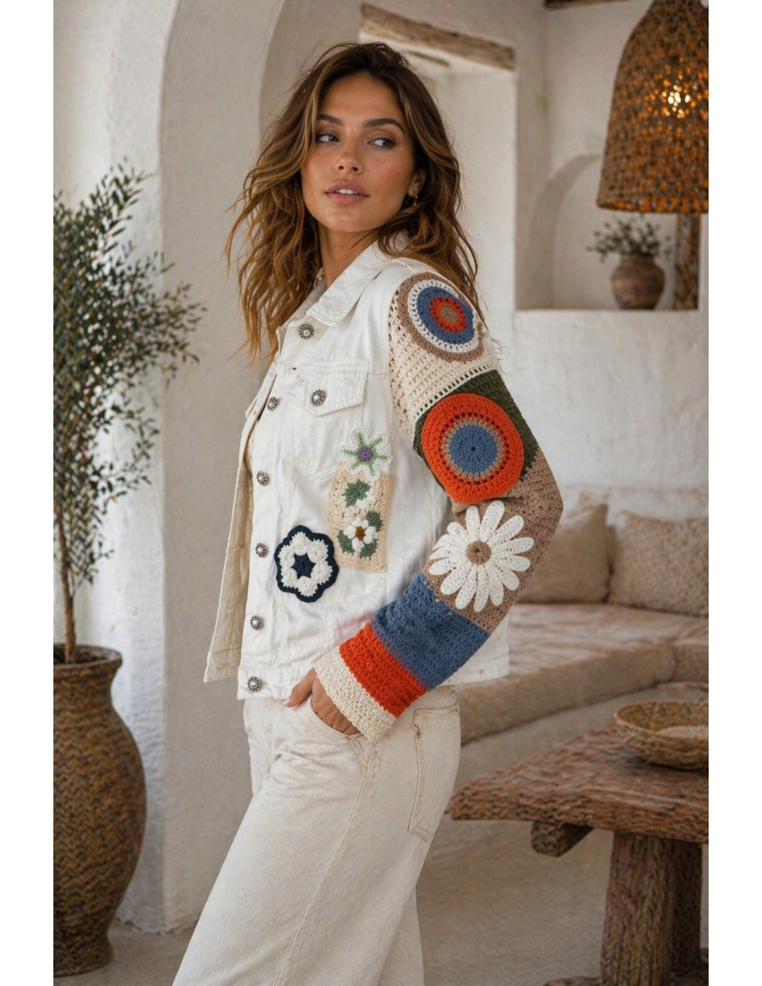 Cazadora vaquera en blanco con mangas de punto a crochet y apliques florales bordados. Elástica y con mucho estilo, ¡una pieza especial!