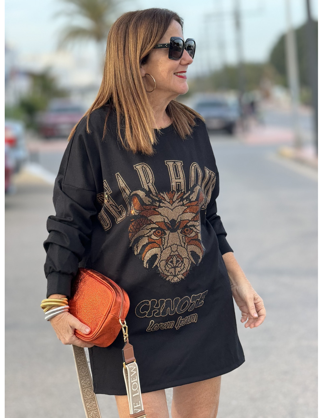¡Deslumbra con este vestido oversize negro con un tigre en strass en el frontal y letras en strass en la espalda!