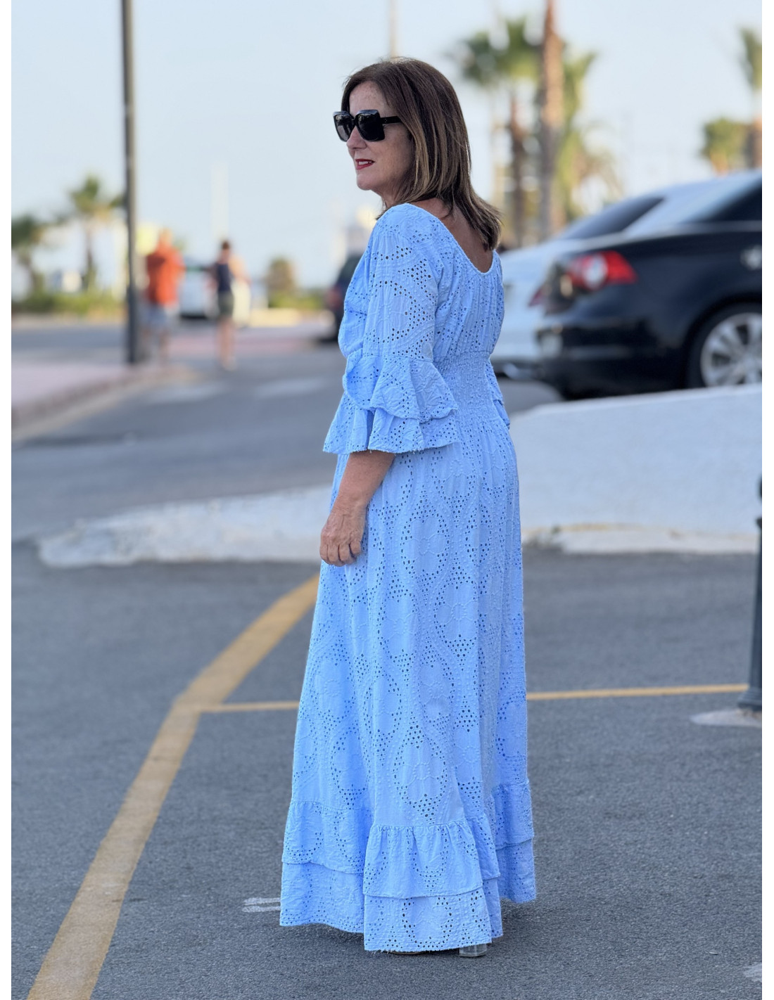 Vestido largo en bordado inglés color celeste, con escote de pico y nido de abeja. Forro interior y manga con pequeño volante.