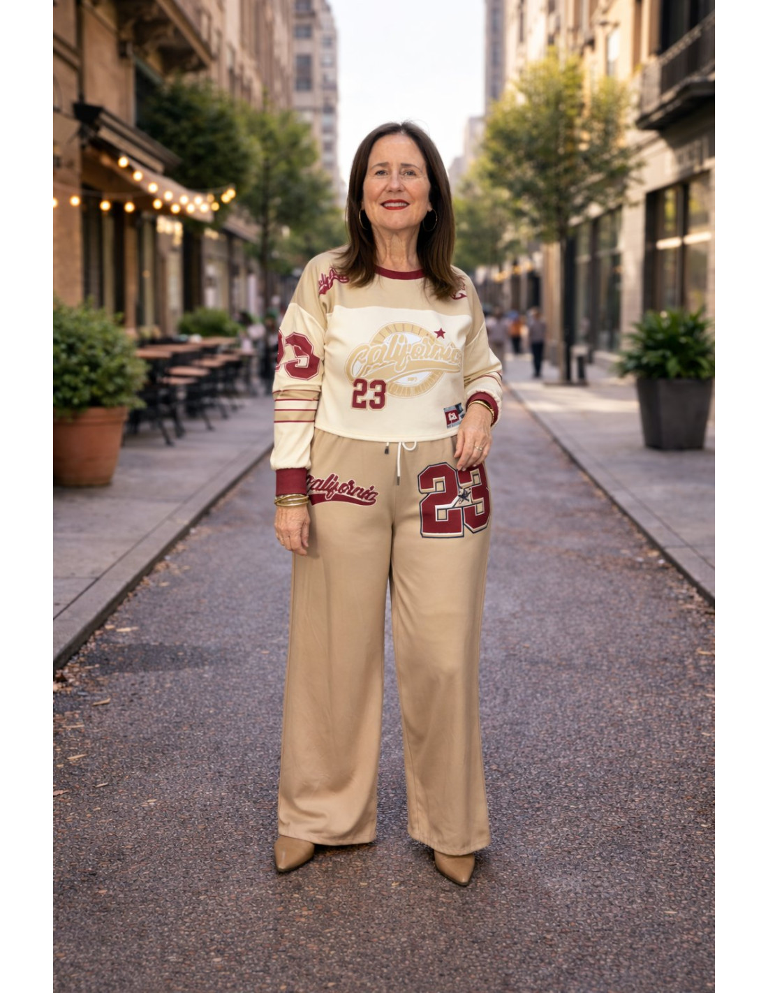 Conjunto de dos piezas en tonos tostado y crudo, con estampado protagonista tal y como se aprecia en la imagen. Un diseño cómodo y con aire sporty chic, ideal para un look actual y desenfadado.