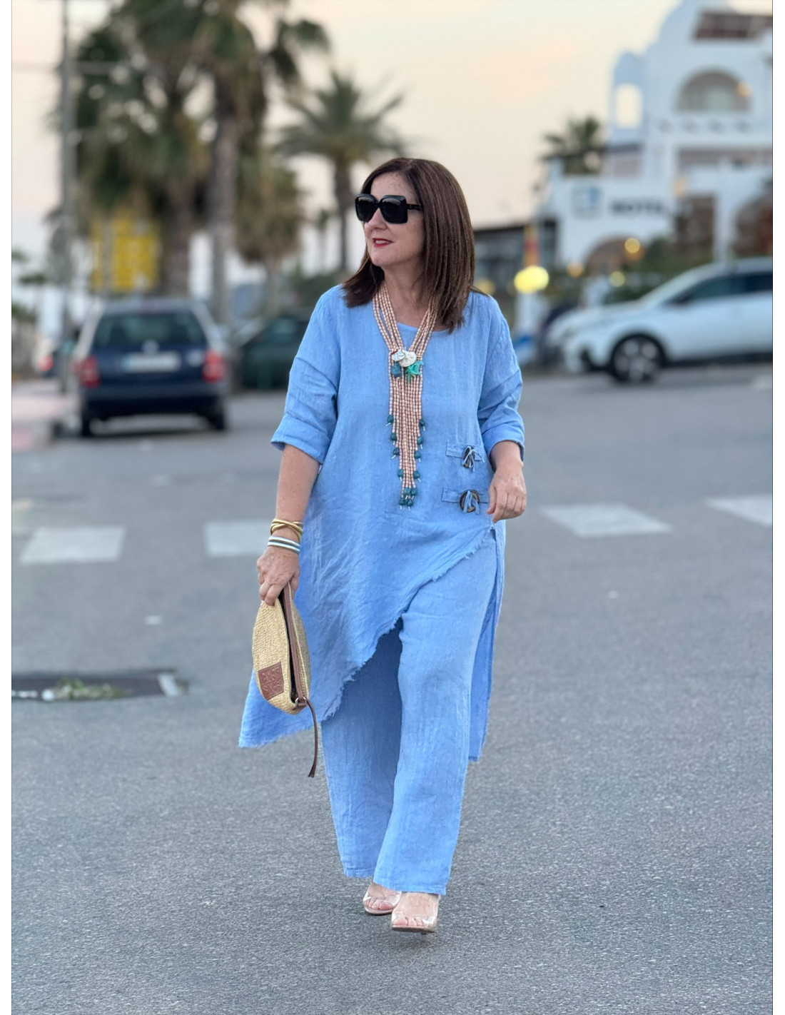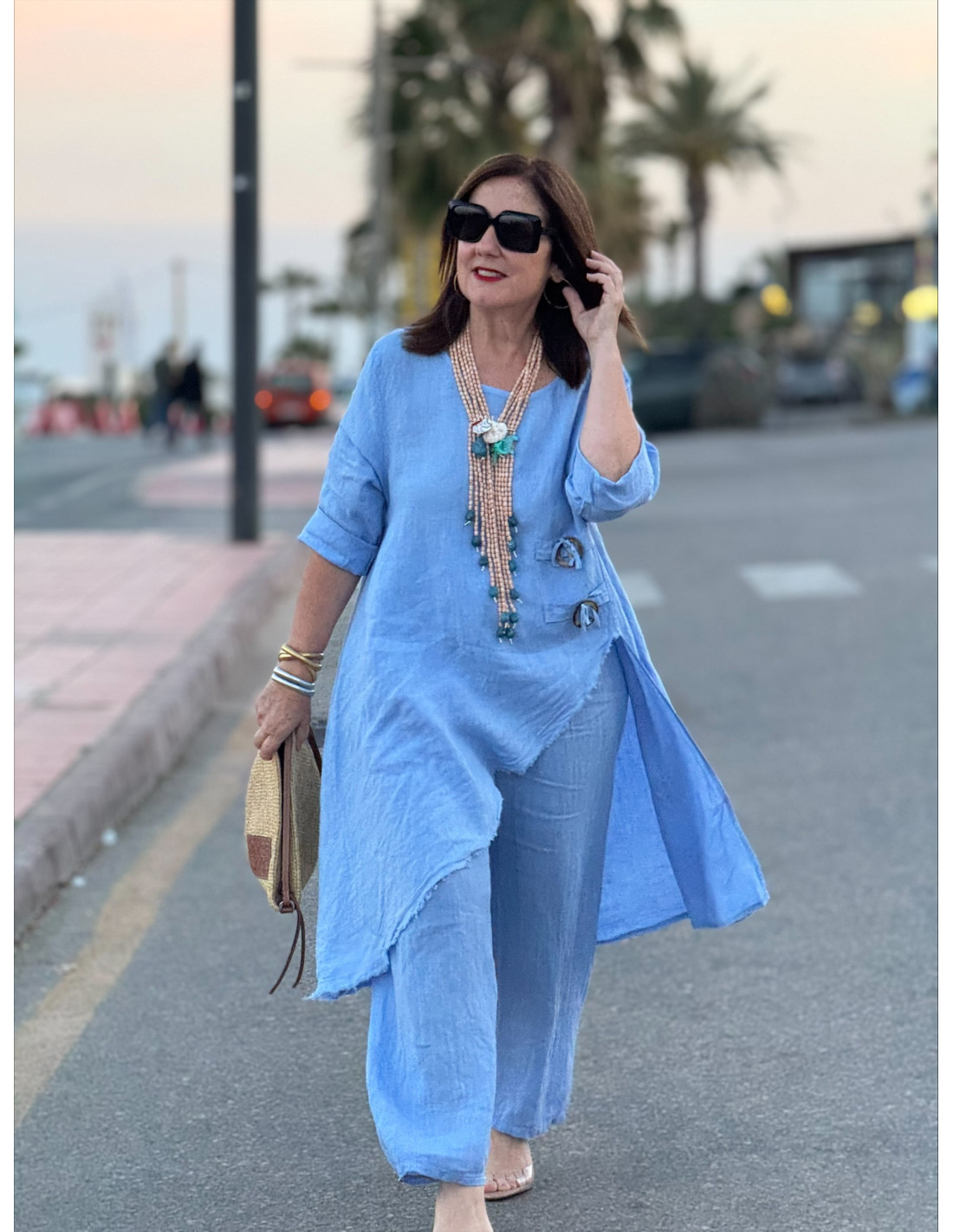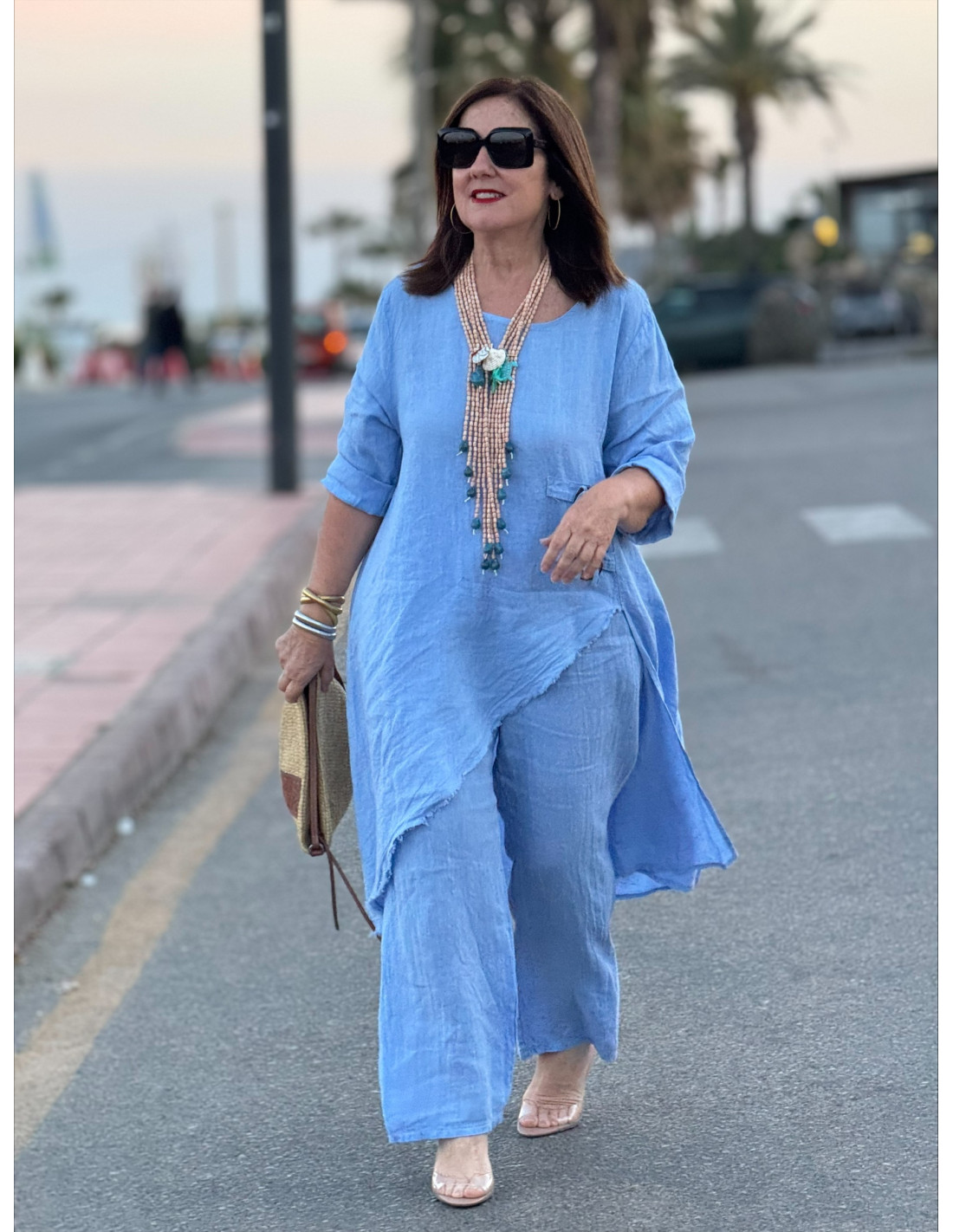 Conjunto de lino en color celeste, ideal para los días de calor gracias a su tejido natural, fresco y ligero. Está compuesto por un blusón de corte asimétrico con detalles en un lateral y terminación desflecada, que aporta un estilo moderno y desenfadado.