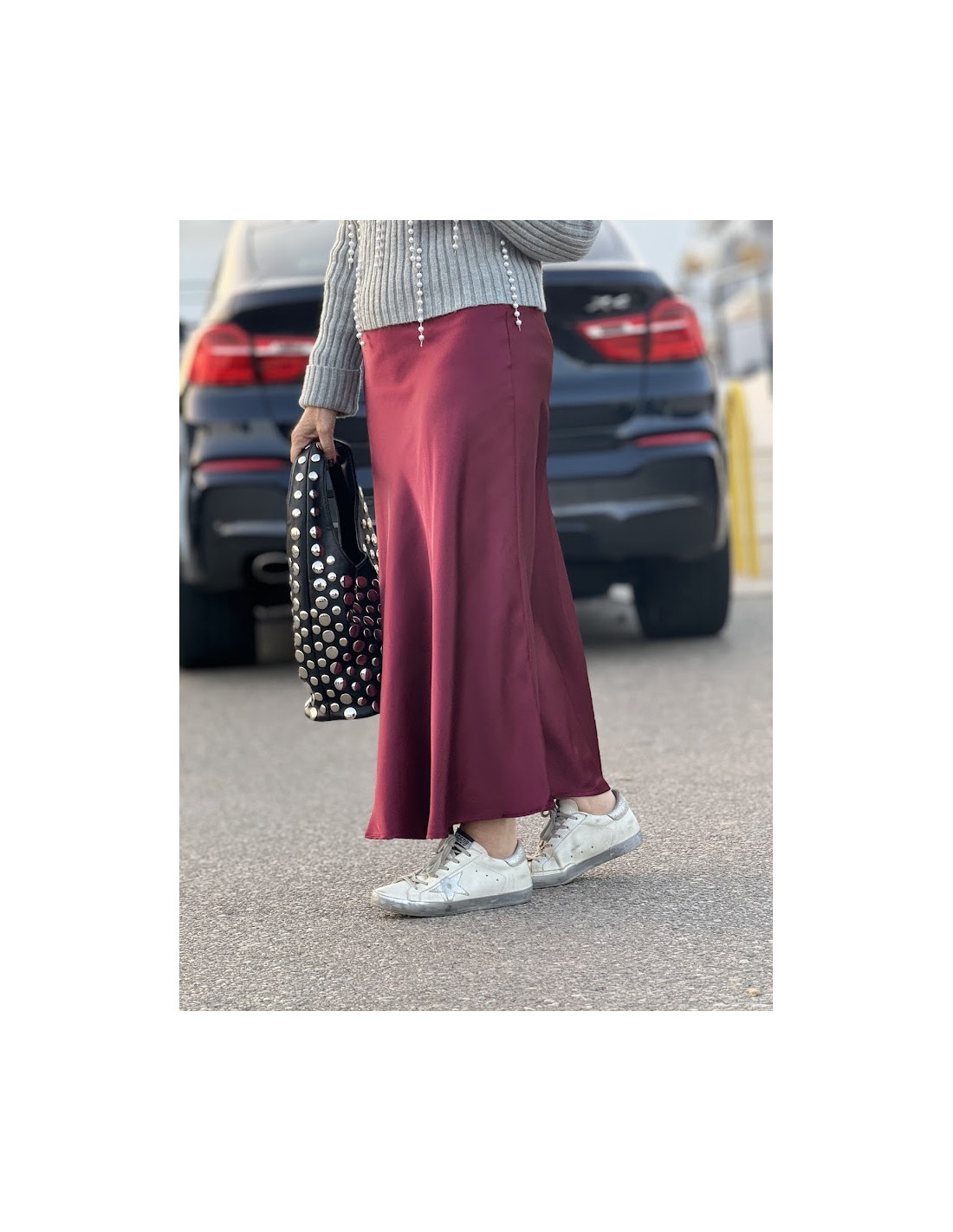 Falda de satén en color granate, con un favorecedor corte evasé y cintura elástica que se adapta perfectamente. Una pieza cómoda y elegante ideal para cualquier ocasión.