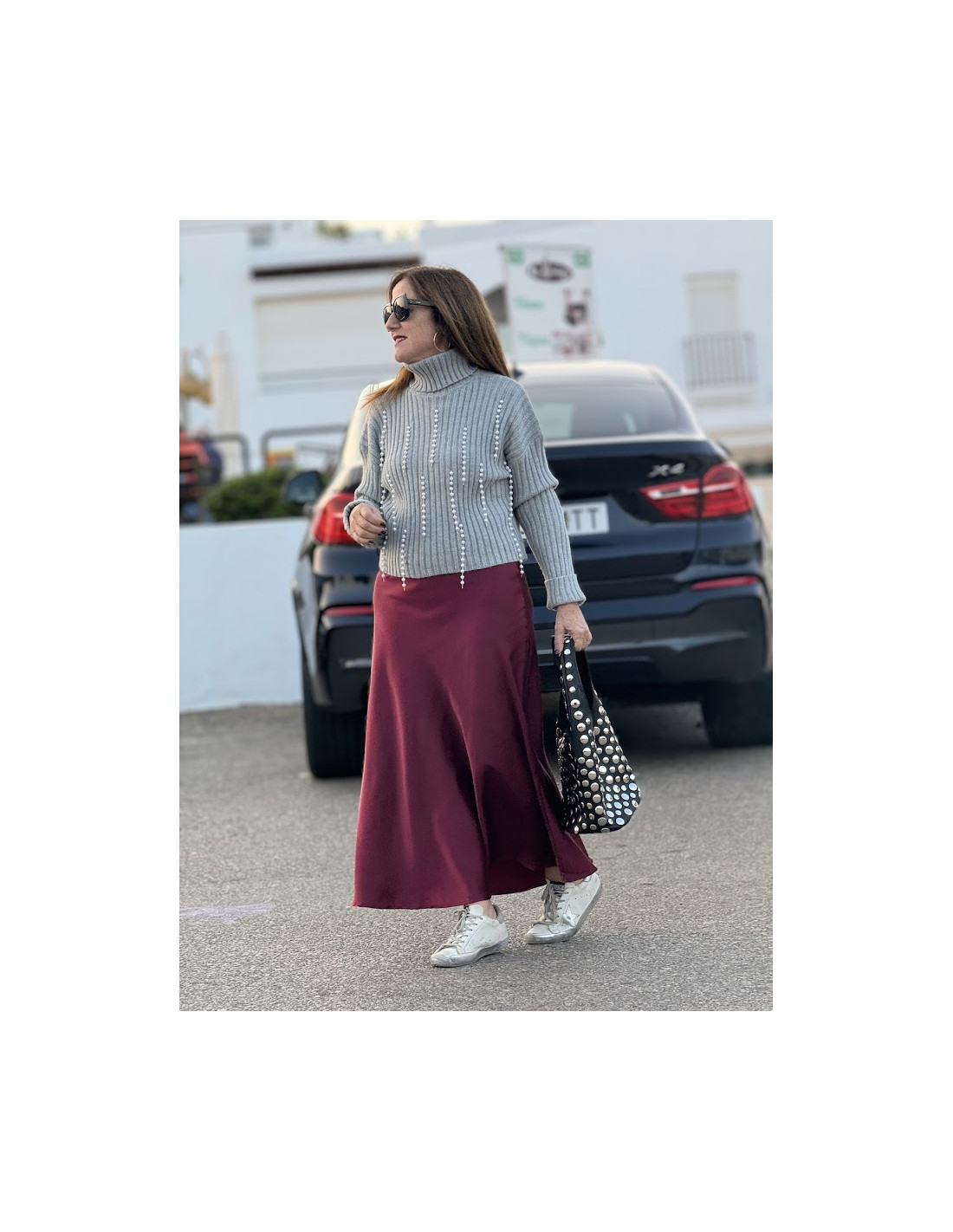 Esta falda en satén de color granate es una pieza que destaca por su elegancia y versatilidad. Con un corte evasé que estiliza la figura, su tejido fluido aporta un movimiento encantador. La cintura elástica proporciona comodidad y ajuste, adaptándose con facilidad a diferentes siluetas. Ideal para combinar con blusas o suéteres, esta falda es perfecta tanto para eventos especiales como para un look casual con estilo.