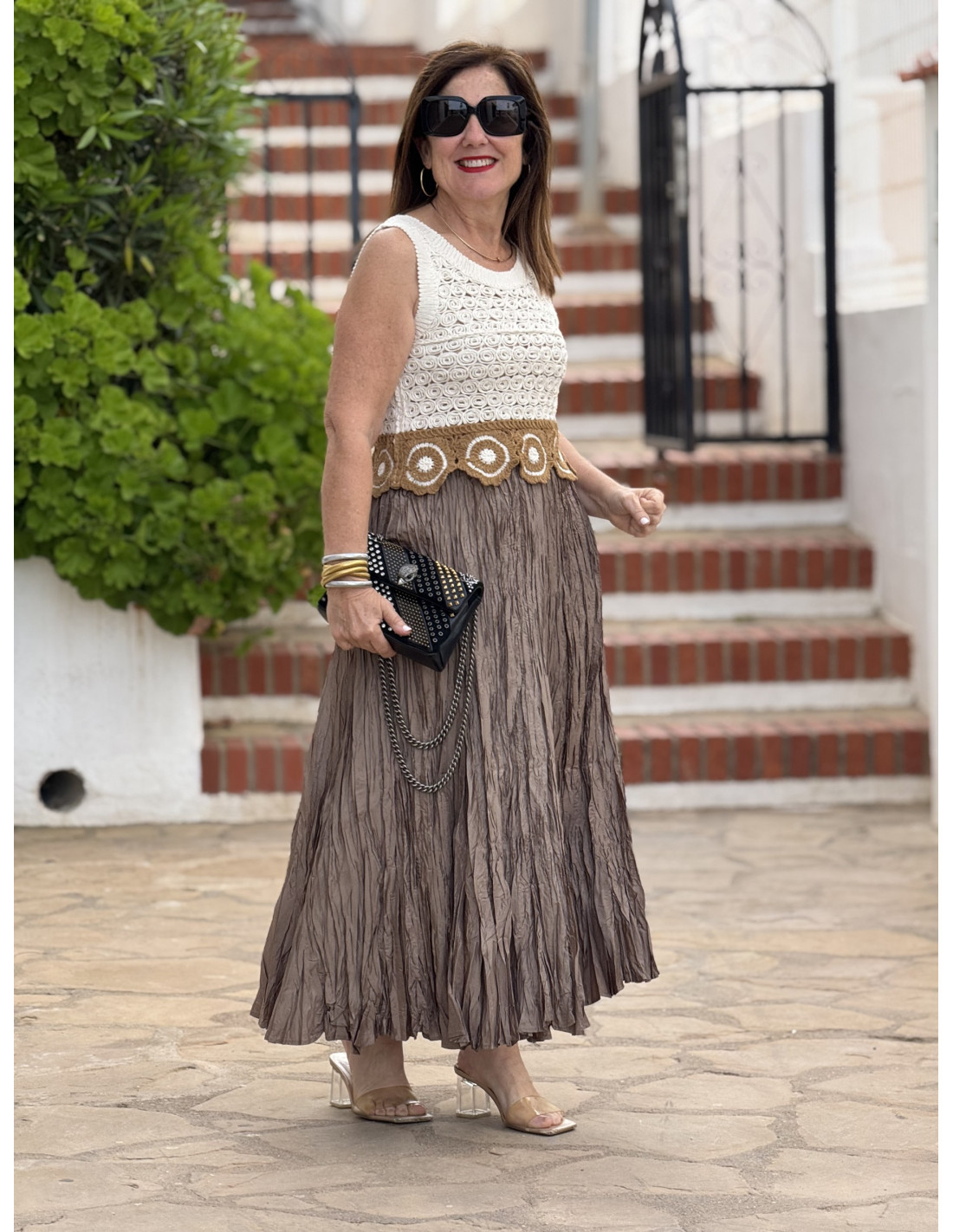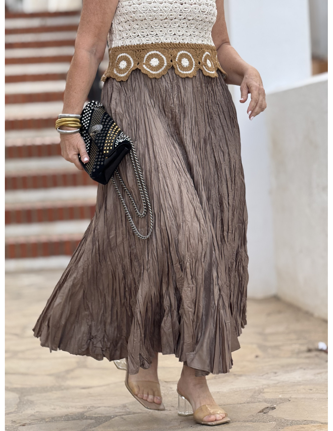 Falda marrón de diseño fluido y efecto arrugado, con cintura elástica que se adapta cómodamente. Ideal para añadir movimiento y estilo a tu atuendo diario.