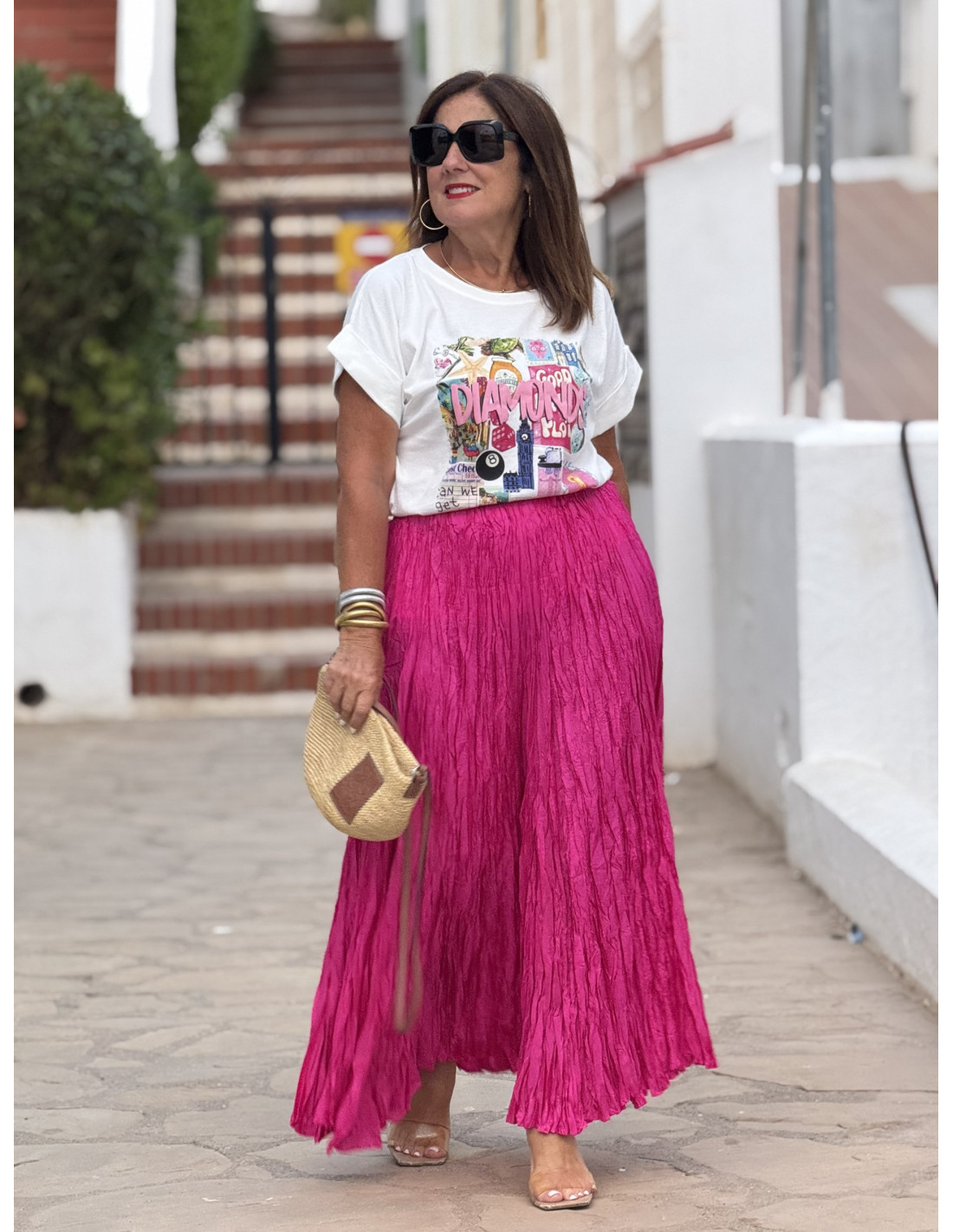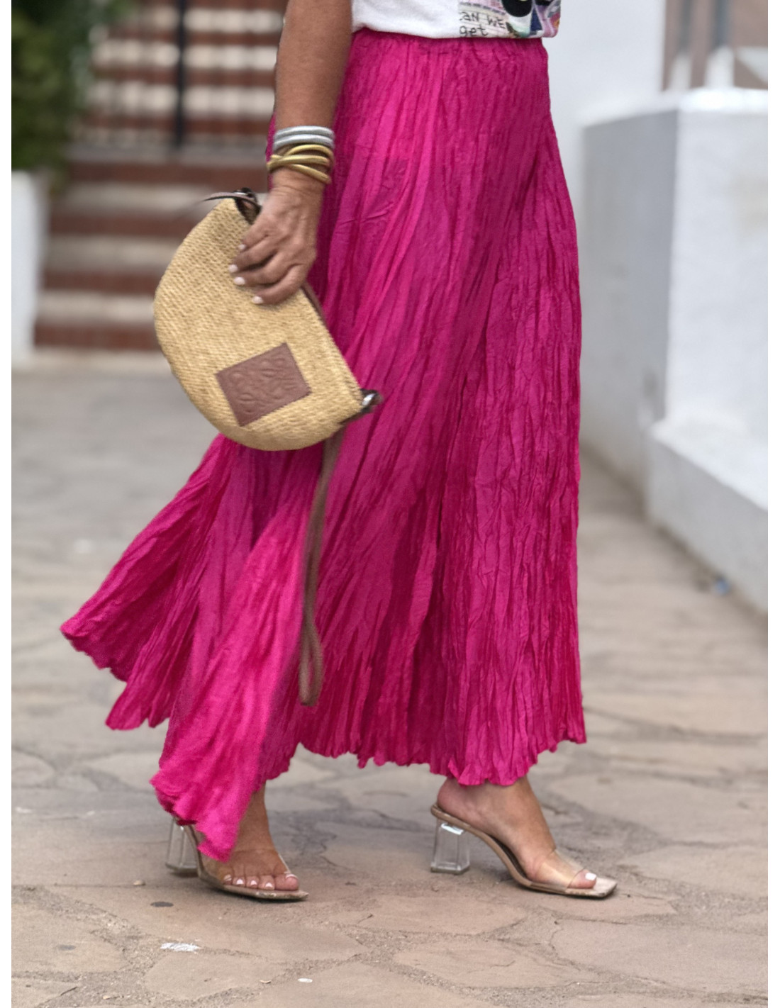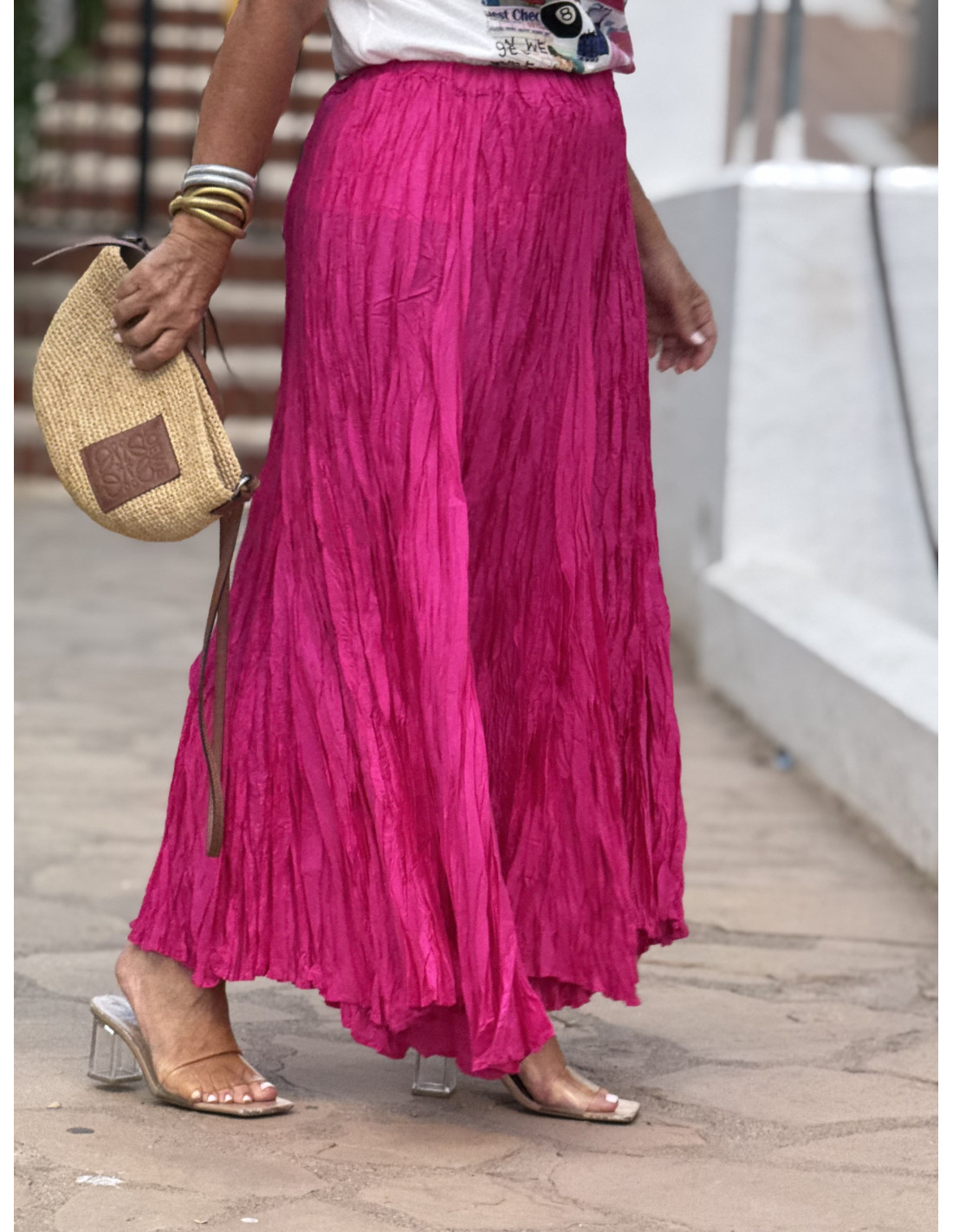 Esta elegante falda rosa destaca por su diseño fluido y efecto arrugado, aportando un toque moderno y sofisticado a cualquier conjunto. La cintura elástica asegura un ajuste cómodo y versátil, adaptándose a diferentes siluetas.