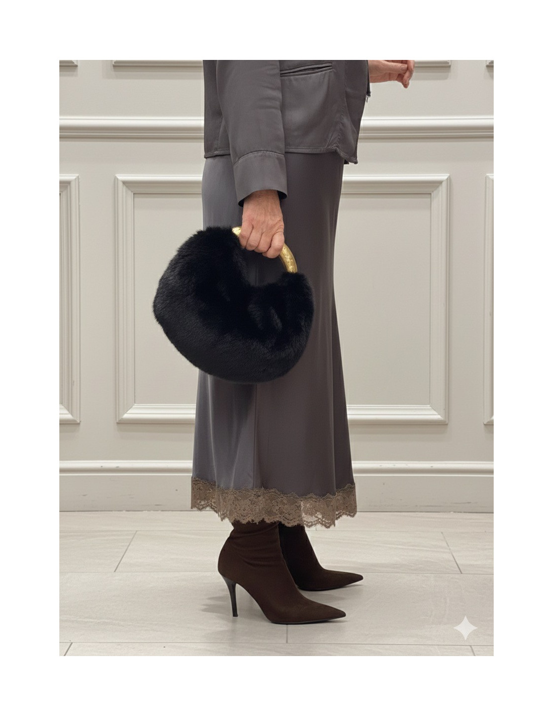Esta falda en satén gris destaca por su brillo suave y elegante, rematada con una fina puntilla en tono taupe que aporta un toque delicado y femenino. Su tejido fluido acompaña el movimiento de forma natural, creando una caída muy favorecedora.