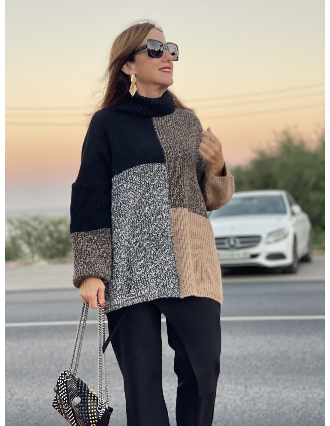 🌟 Suéter Cuello Alto Estampado Geométrico en Negro y Camel 🌈