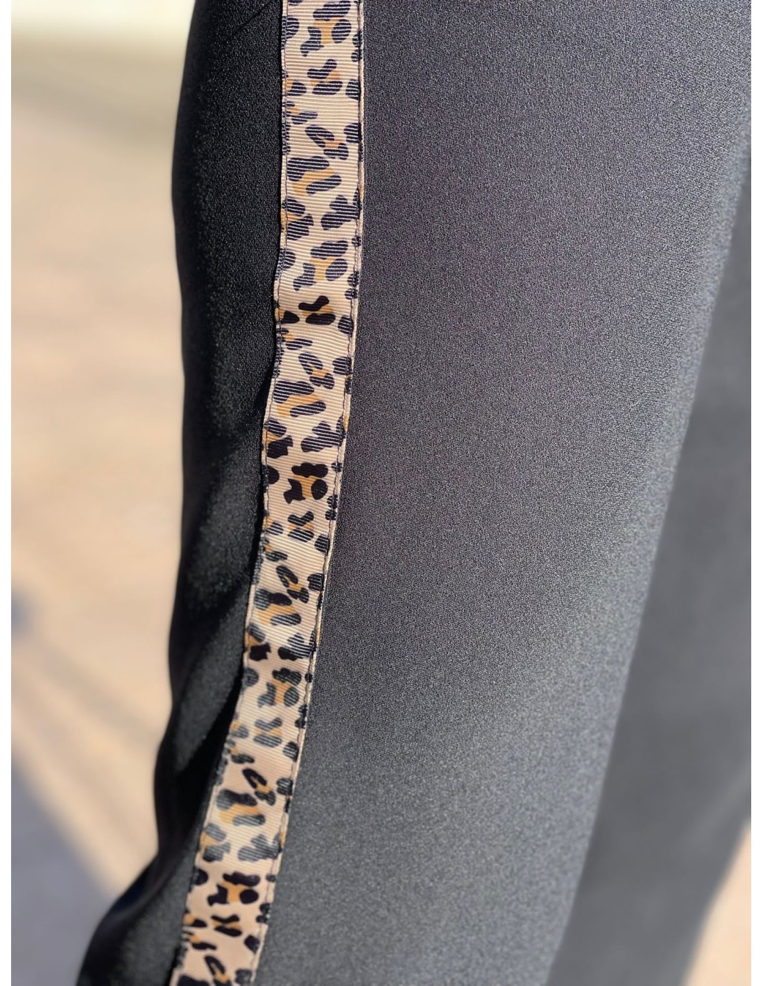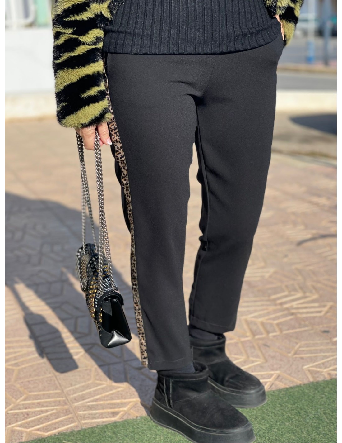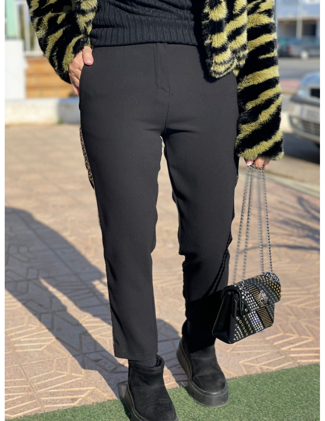 Descubre nuestro pantalón negro con banda lateral de animal print. Único y versátil, añade un toque salvaje a tu estilo. 🌟👖
