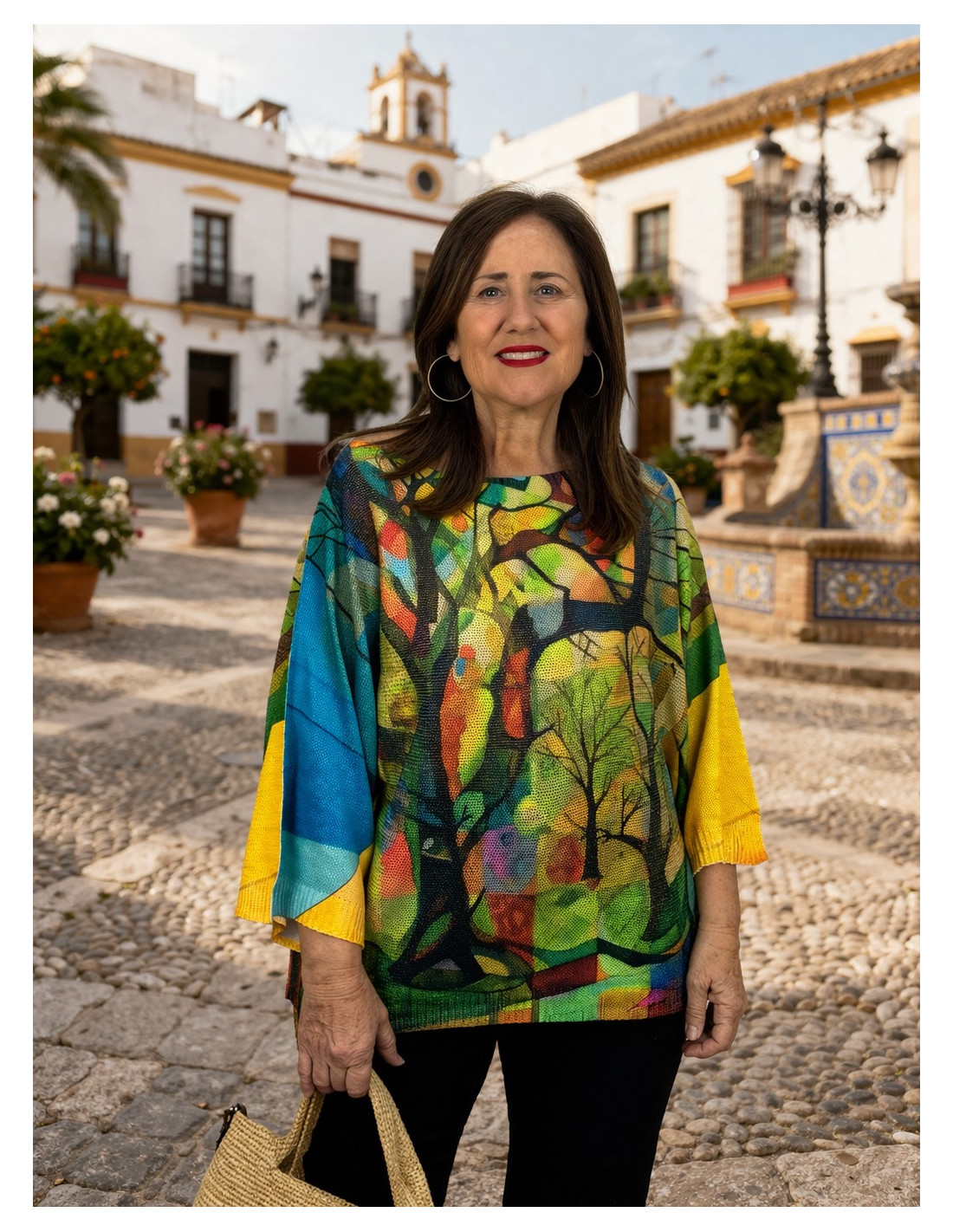 Suéter de hilo ligero con un bonito estampado multicolor de inspiración artística tanto en el frontal como en la espalda.