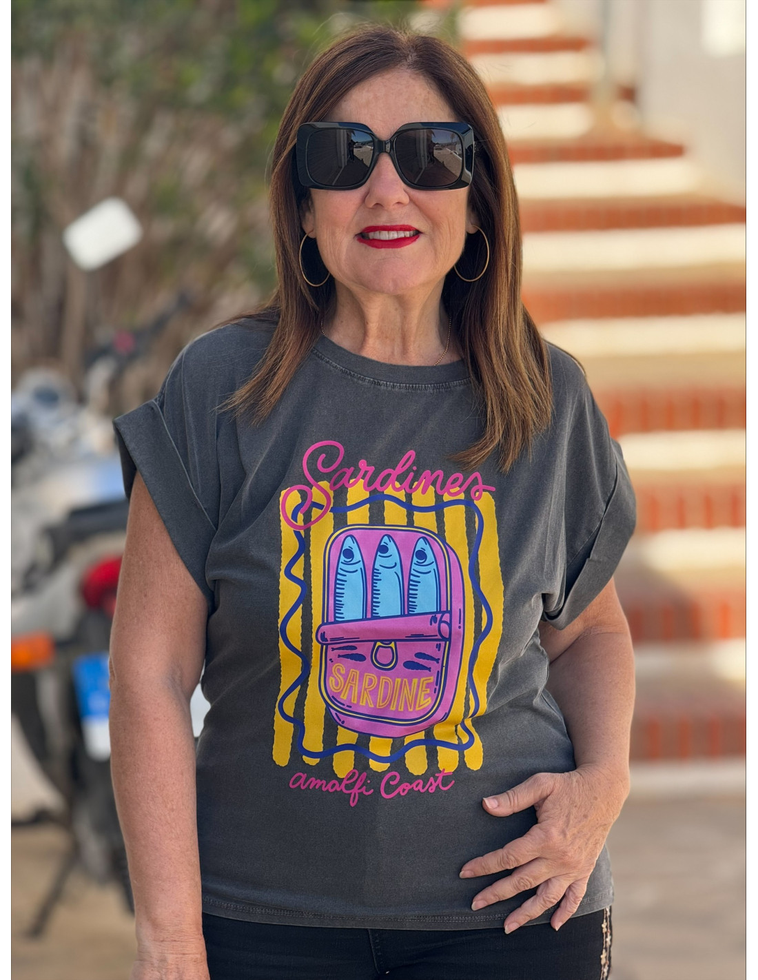 Camiseta gris efecto lavado con dibujo de sardinas en el frontal. Diseño original, cómoda y muy fácil de combinar.