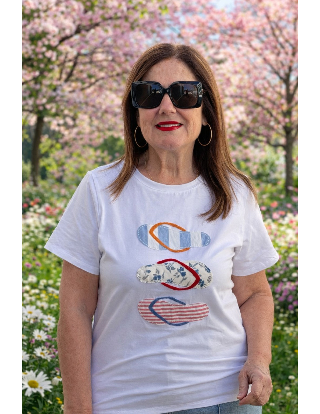 Esta camiseta blanca de manga corta es el básico perfecto con un toque divertido y original. Su diseño de chanclas en el frontal, confeccionado con diferentes tejidos y estampados, aporta textura y personalidad a la prenda.