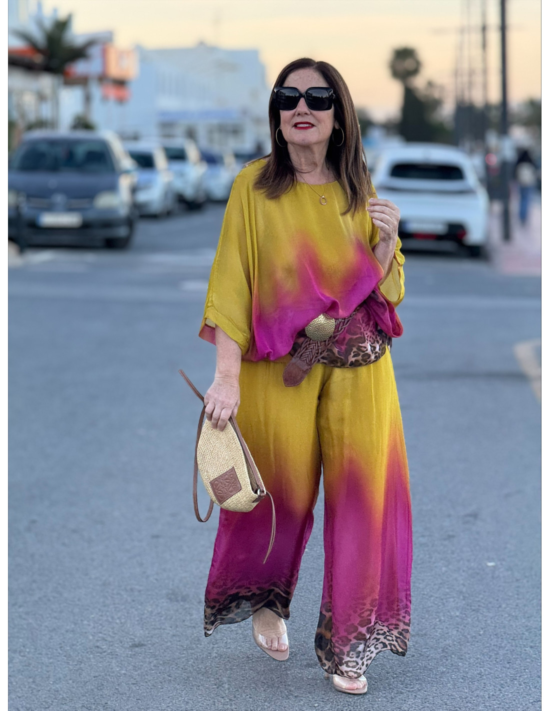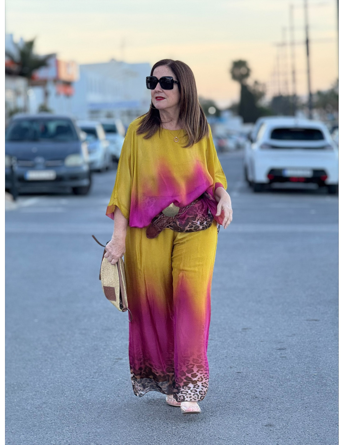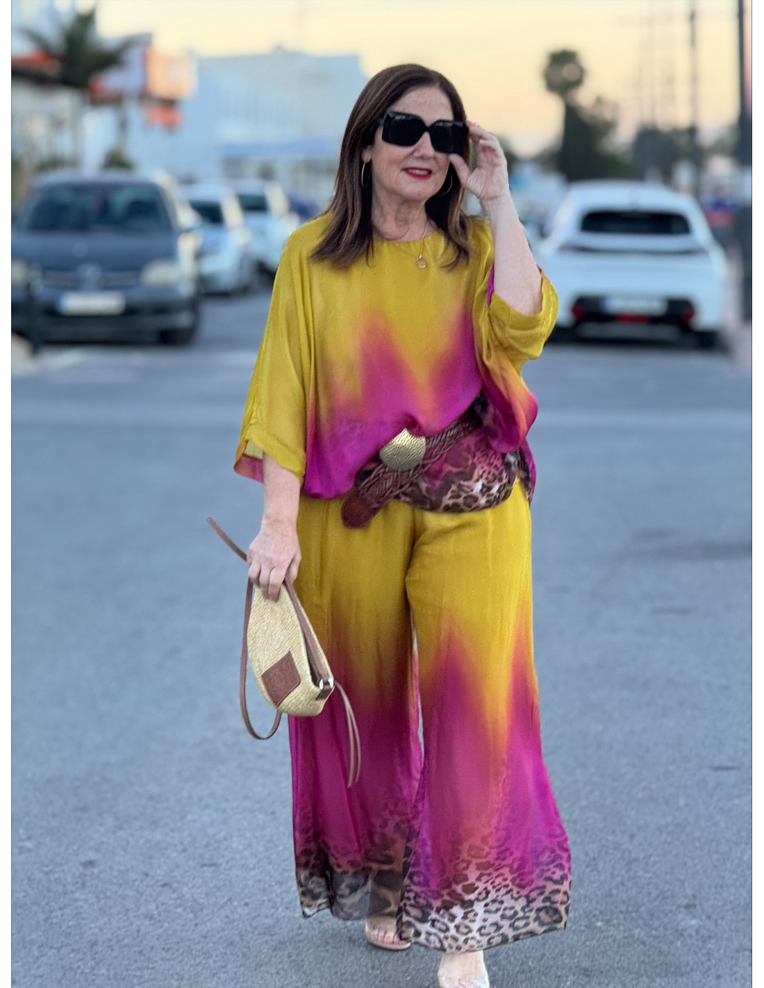 Este conjunto de punto seda es una auténtica declaración de estilo. Su diseño en tonos degradados, que combina colores vibrantes con un sutil toque animal print, crea un efecto visual único y muy favorecedor.