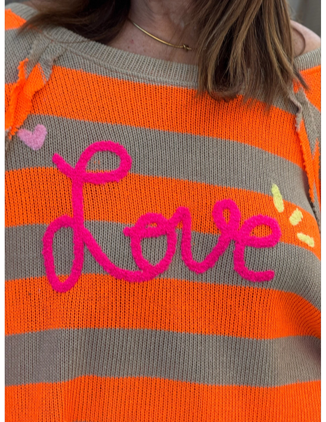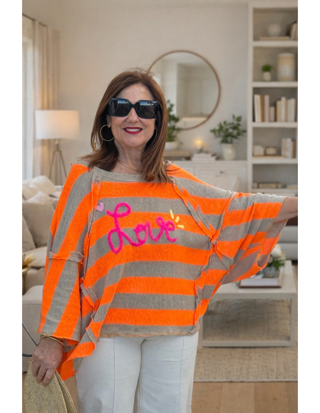 Suéter de punto en hilo suave con diseño de franjas en tonos crudo y naranja, muy llamativo y favorecedor. Destaca por su bordado “Love” en el frontal que le aporta un toque original. Su corte amplio y fluido lo hace muy cómodo, ideal para looks casual con estilo.