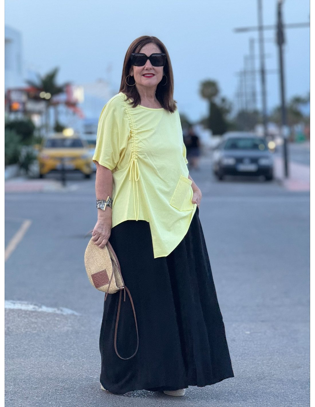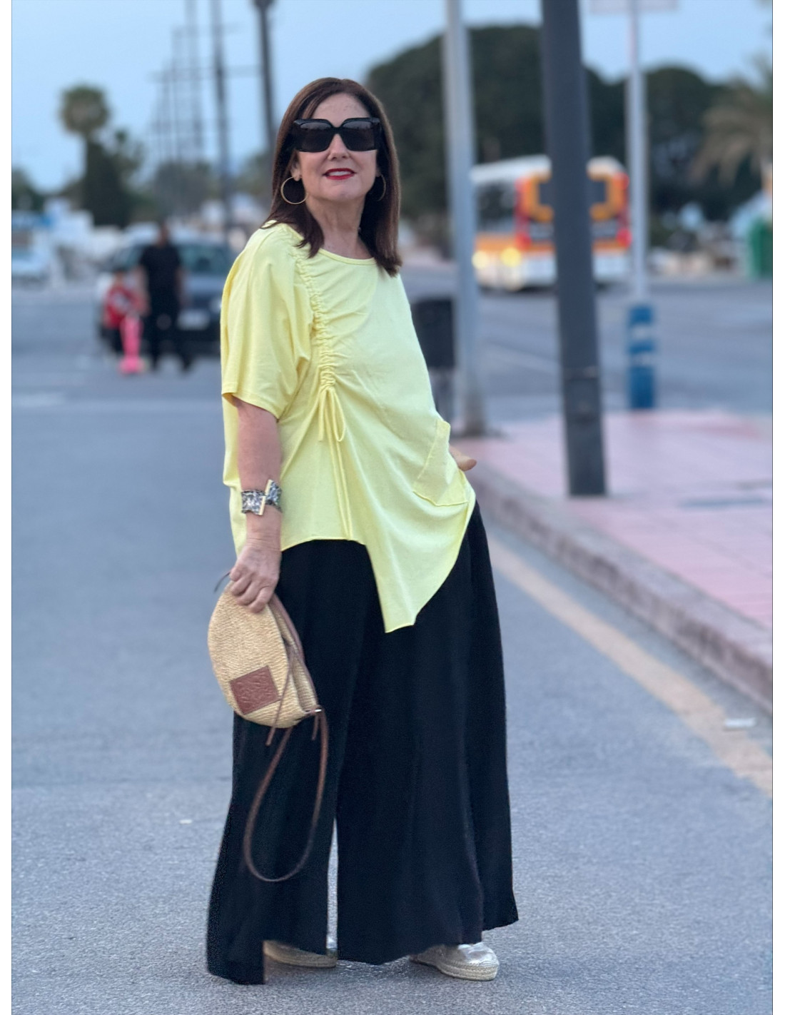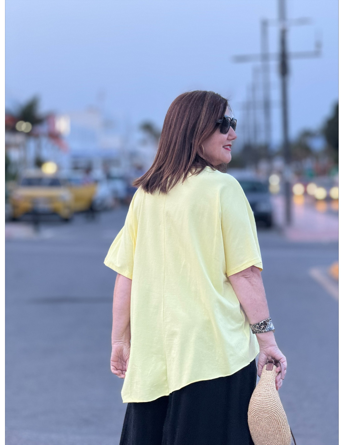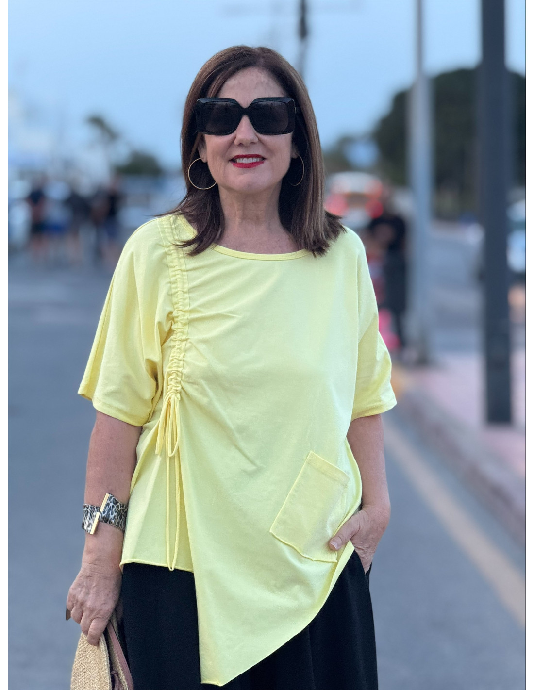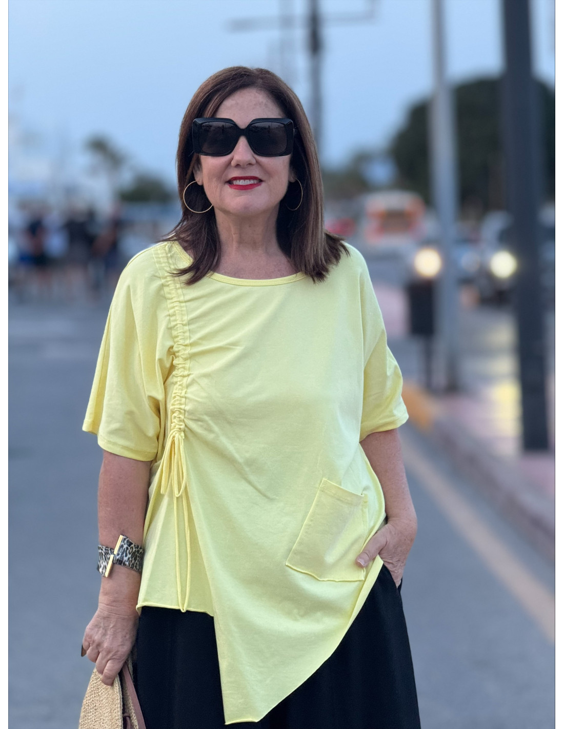 Camiseta amarilla con detalle de fruncido en un lateral, bajo asimétrico y bolsillo frontal. Muy cómoda y favorecedora.