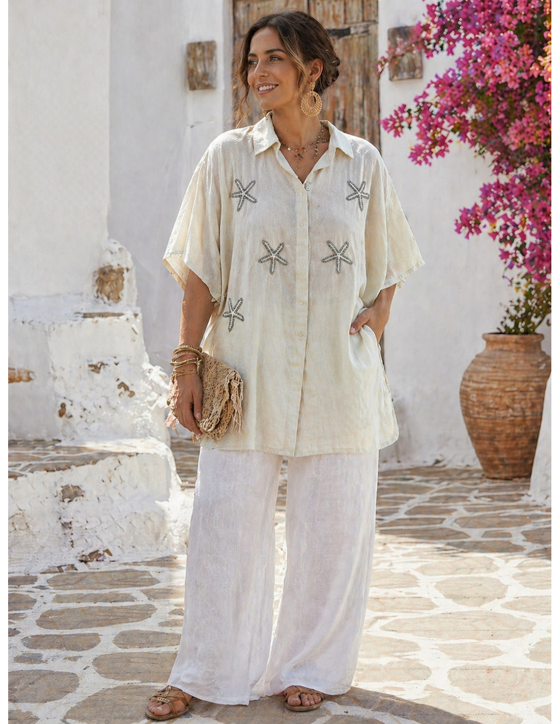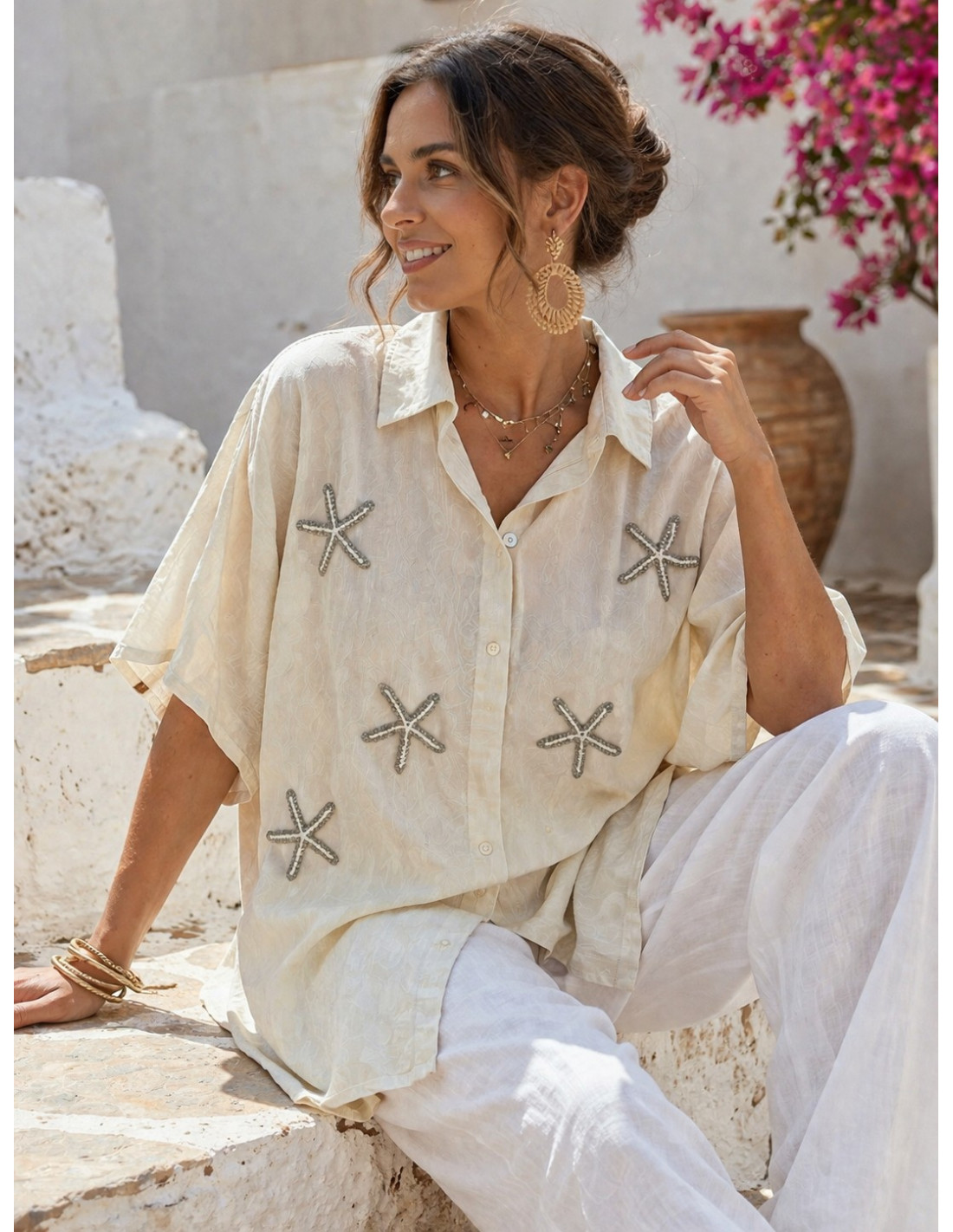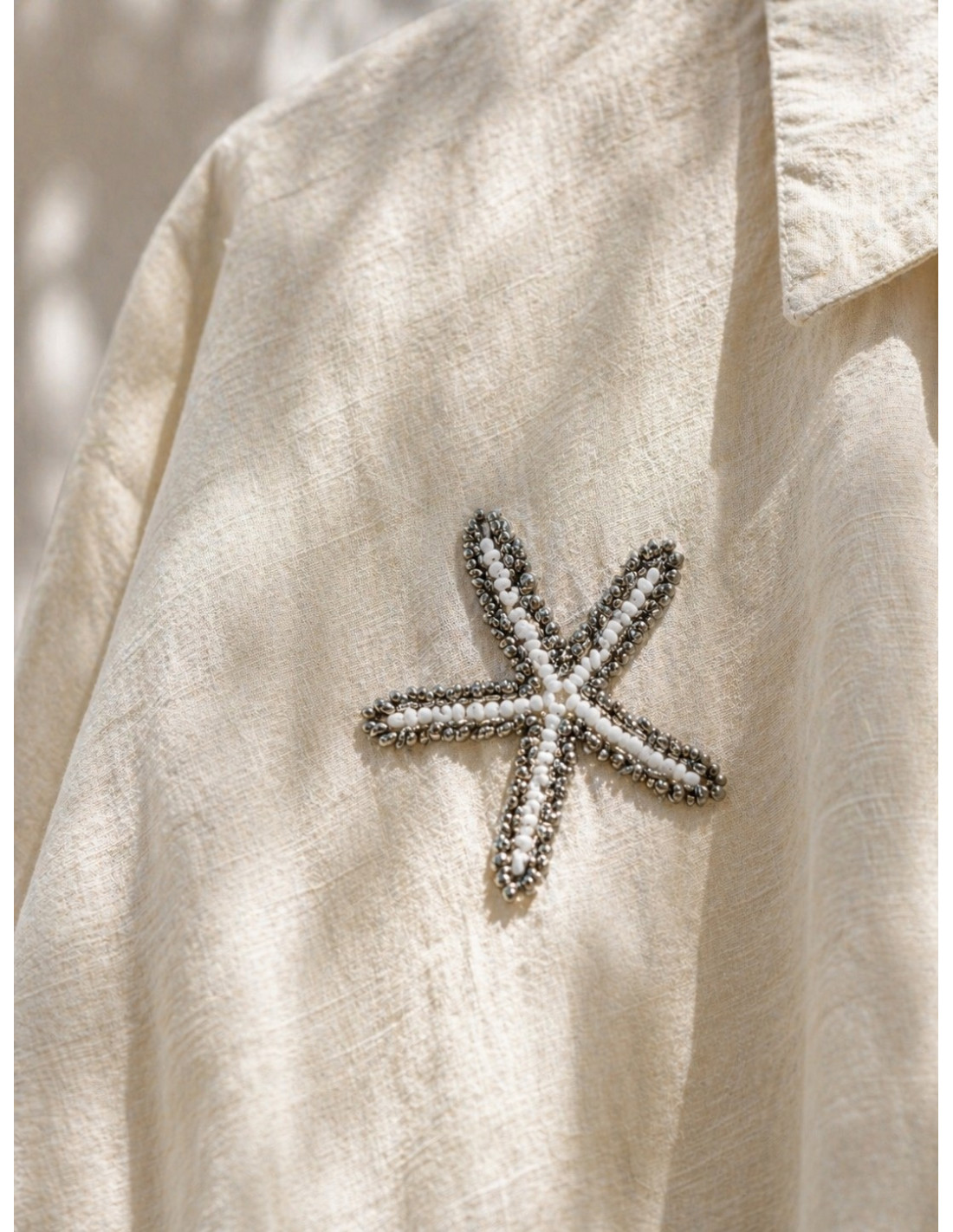 Una camisa diferente y con encanto, perfecta para dar un toque especial a tus looks. Sus estrellas de mar bordadas aportan un aire fresco y muy original.