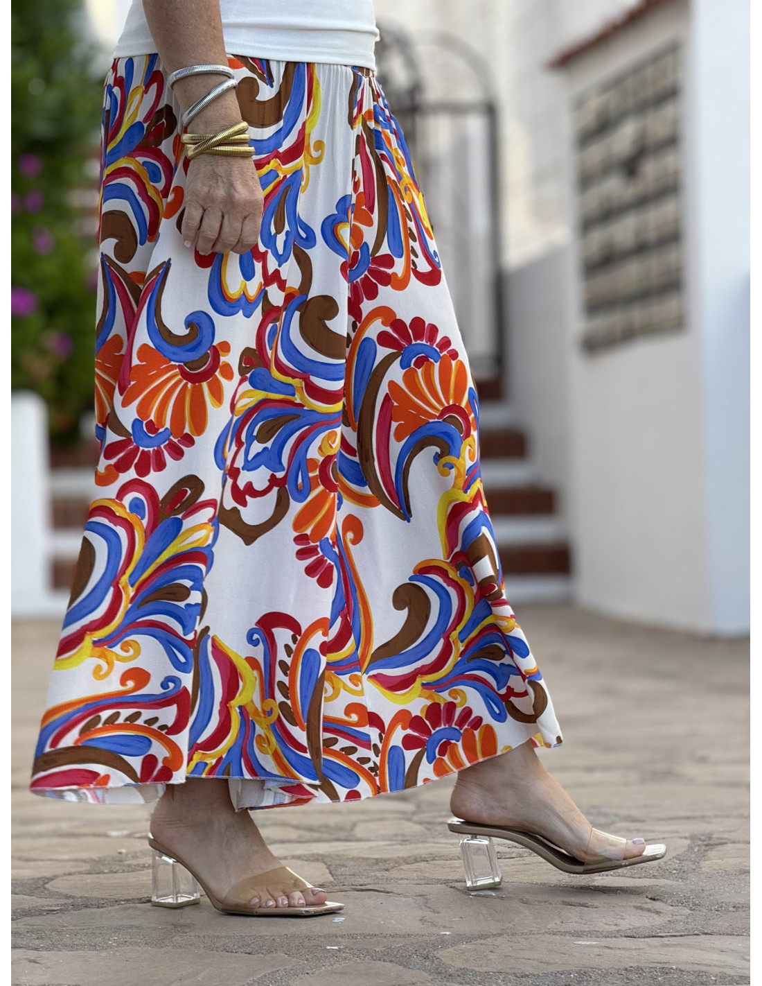 👖 Pantalón blanco con estampado en colores y cintura elástica.