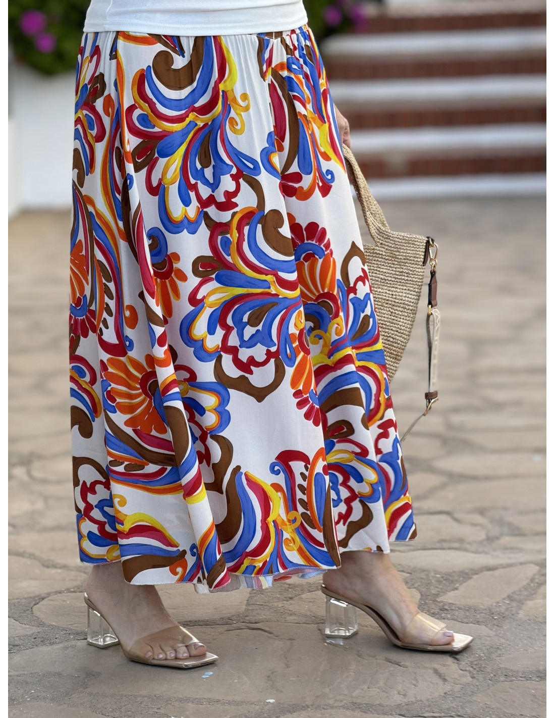 Añade un toque de color a tu estilo con nuestro espectacular pantalón blanco. Presenta un vibrante estampado en colores y una cómoda cintura elástica que se adapta a varias tallas. Con medidas de cintura de 33cm (contorno 66cm) y estirada hasta 57cm (contorno 114cm), y un largo de 91cm, este pantalón es perfecto para lucir con estilo y comodidad. Fabricado con 100% viscosa, garantizando suavidad y confort durante todo el día. 👖