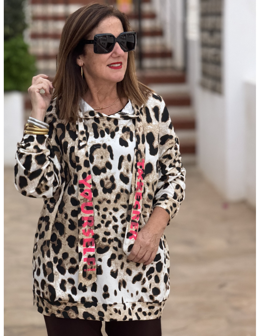 Esta sudadera print con capucha es la mezcla perfecta de estilo urbano y comodidad. Su estampado en animal print le da un toque atrevido y moderno, mientras que las tiras decorativas con letras en fucsia añaden un contraste vibrante y divertido. Ideal para quienes buscan una prenda que no pase desapercibida.