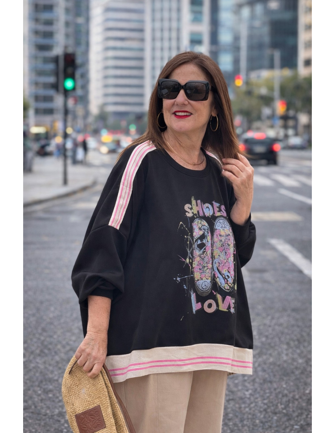 Sudadera negra oversize con deportivas en colores flúor en el frontal. Diseño moderno y original con corte asimétrico que estiliza y aporta un toque muy actual.