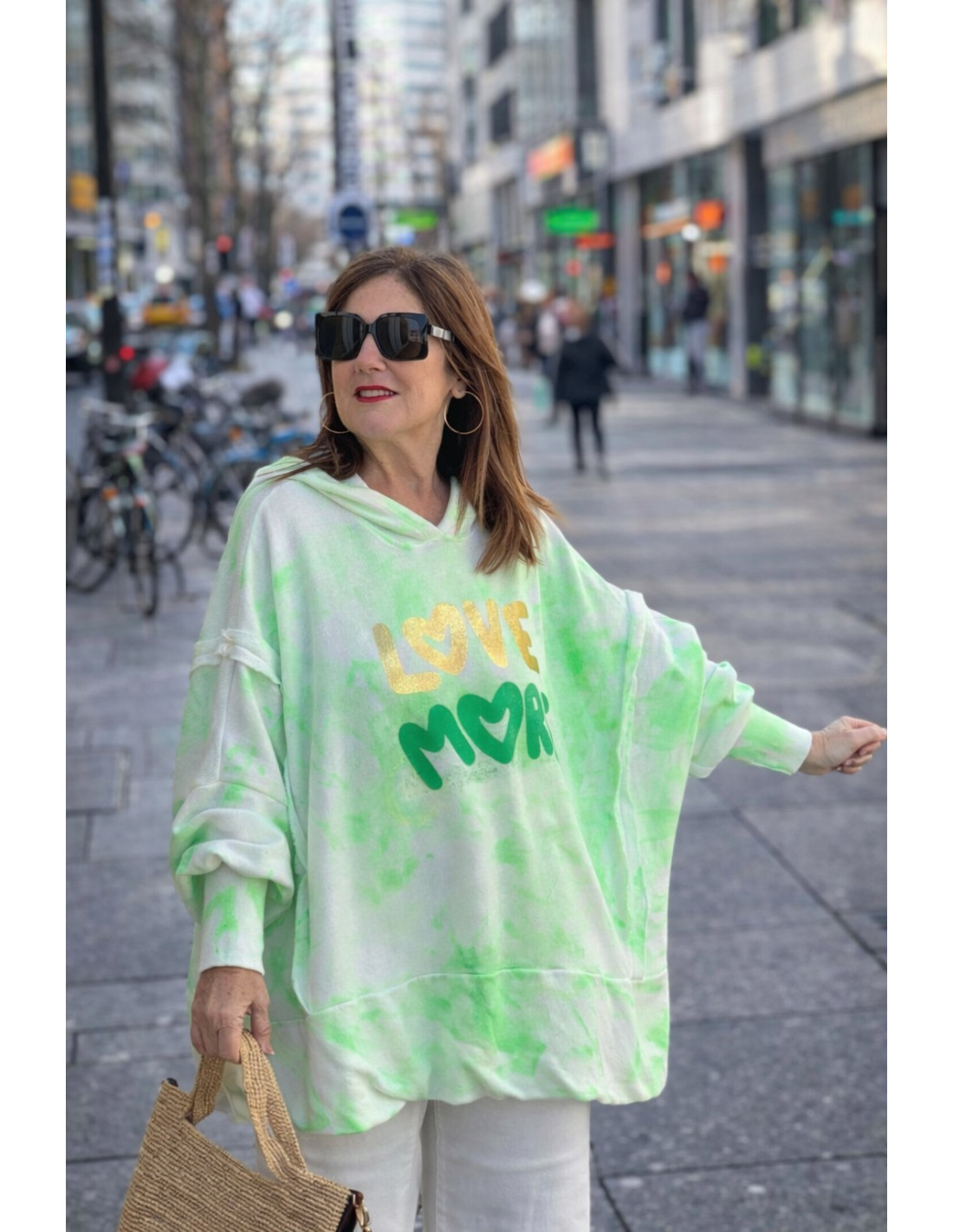 Sudadera de estilo casual con estampado tie dye en verde flúor que aporta un aire moderno y lleno de personalidad. Su diseño oversize resulta muy favorecedor y cómodo, ideal para crear looks relajados pero con estilo.