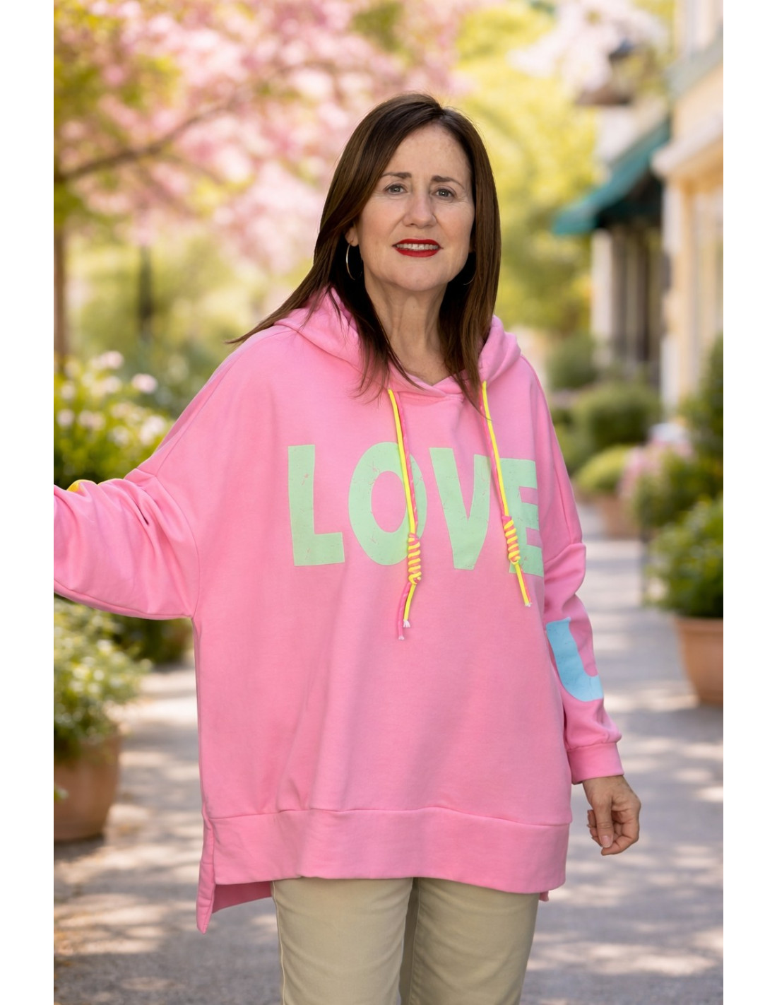 Sudadera rosa oversize con capucha y mensaje “Love” en el frontal. Detalle de cordones en color flúor que aportan un toque moderno y muy favorecedor.