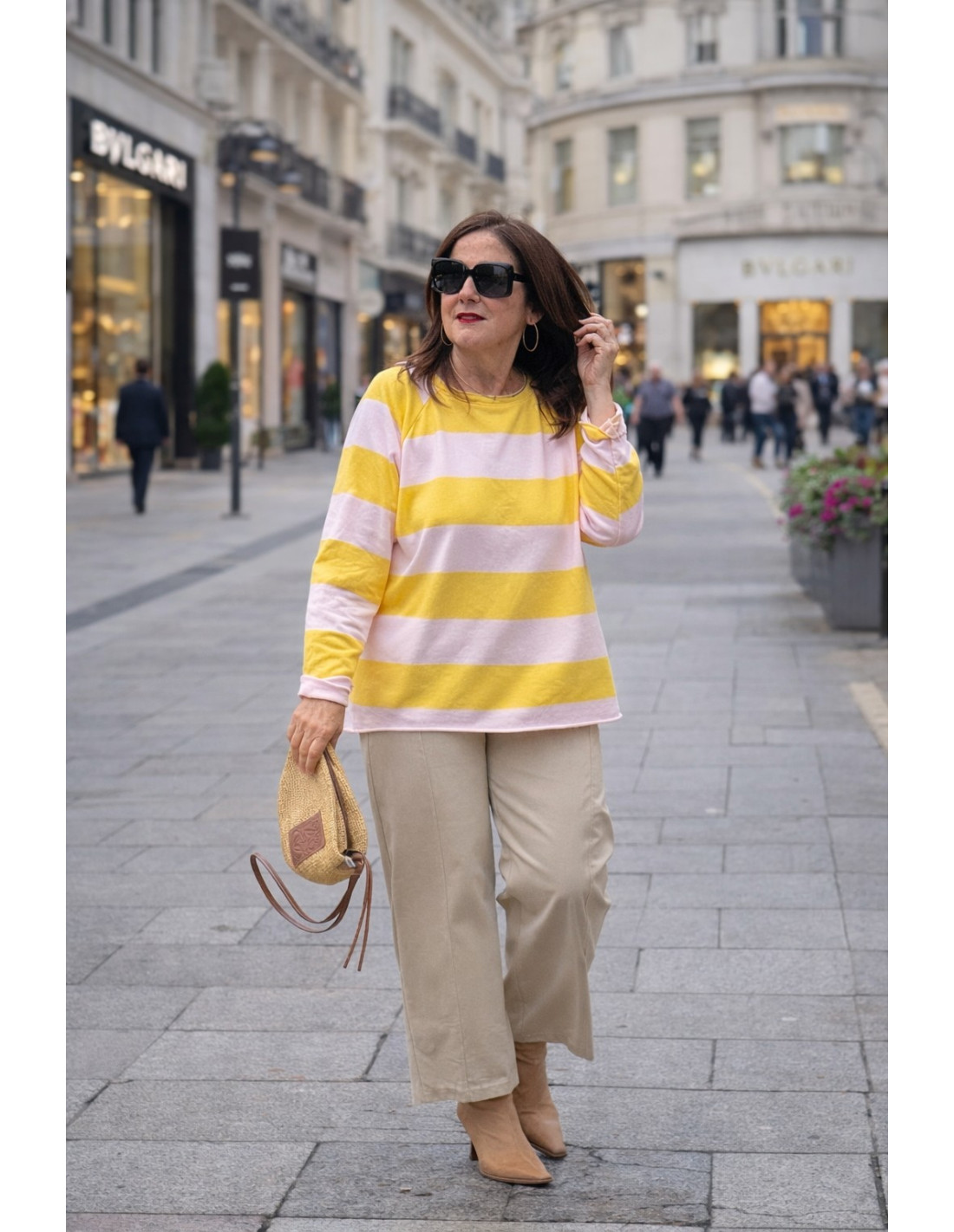 Sudadera tipo camiseta con un alegre estampado de rayas anchas en tonos rosa y amarillo que aporta un estilo fresco, moderno y muy favorecedor. Su diseño relajado la convierte en una prenda muy cómoda y fácil de llevar en el día a día.