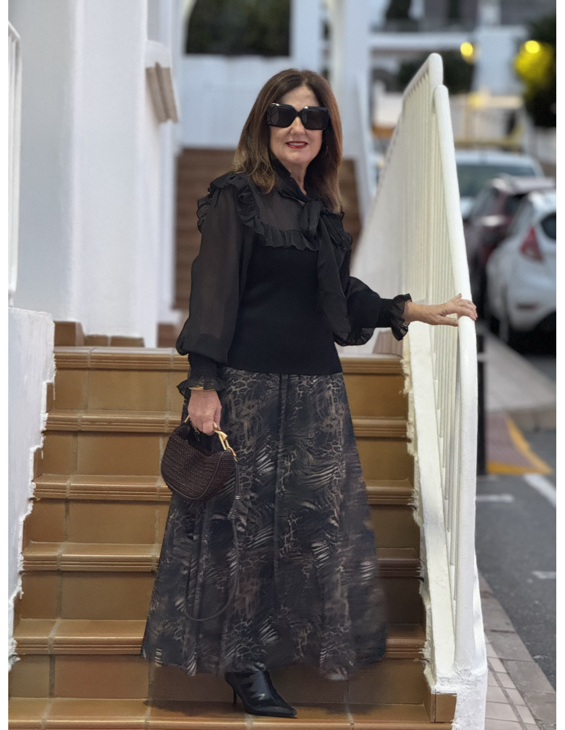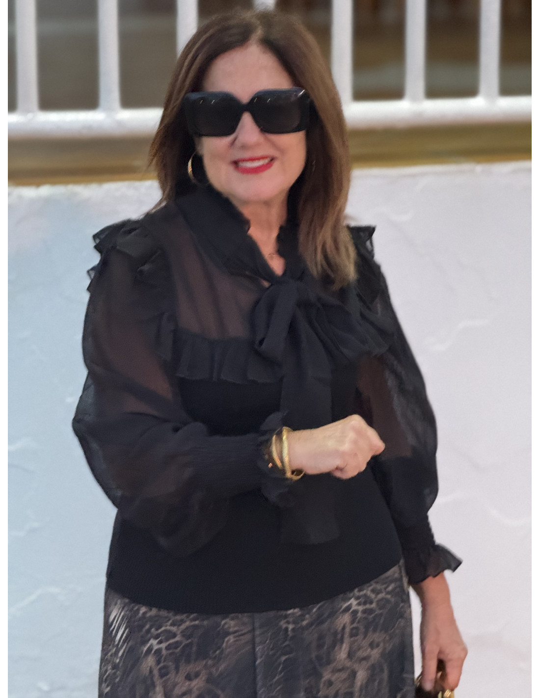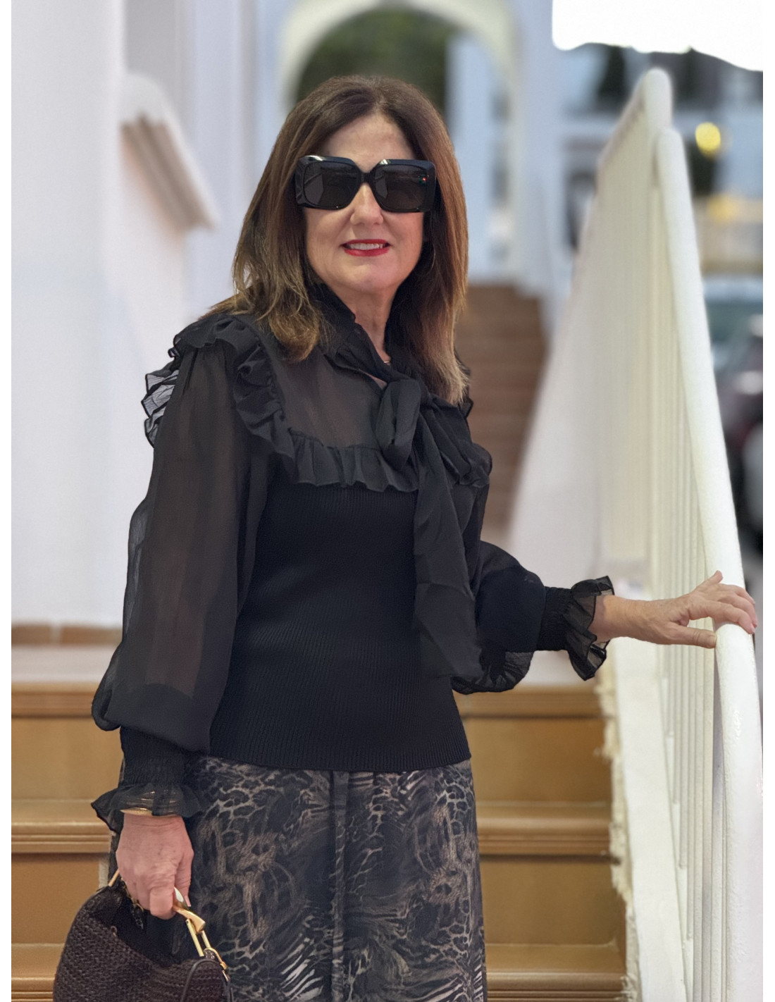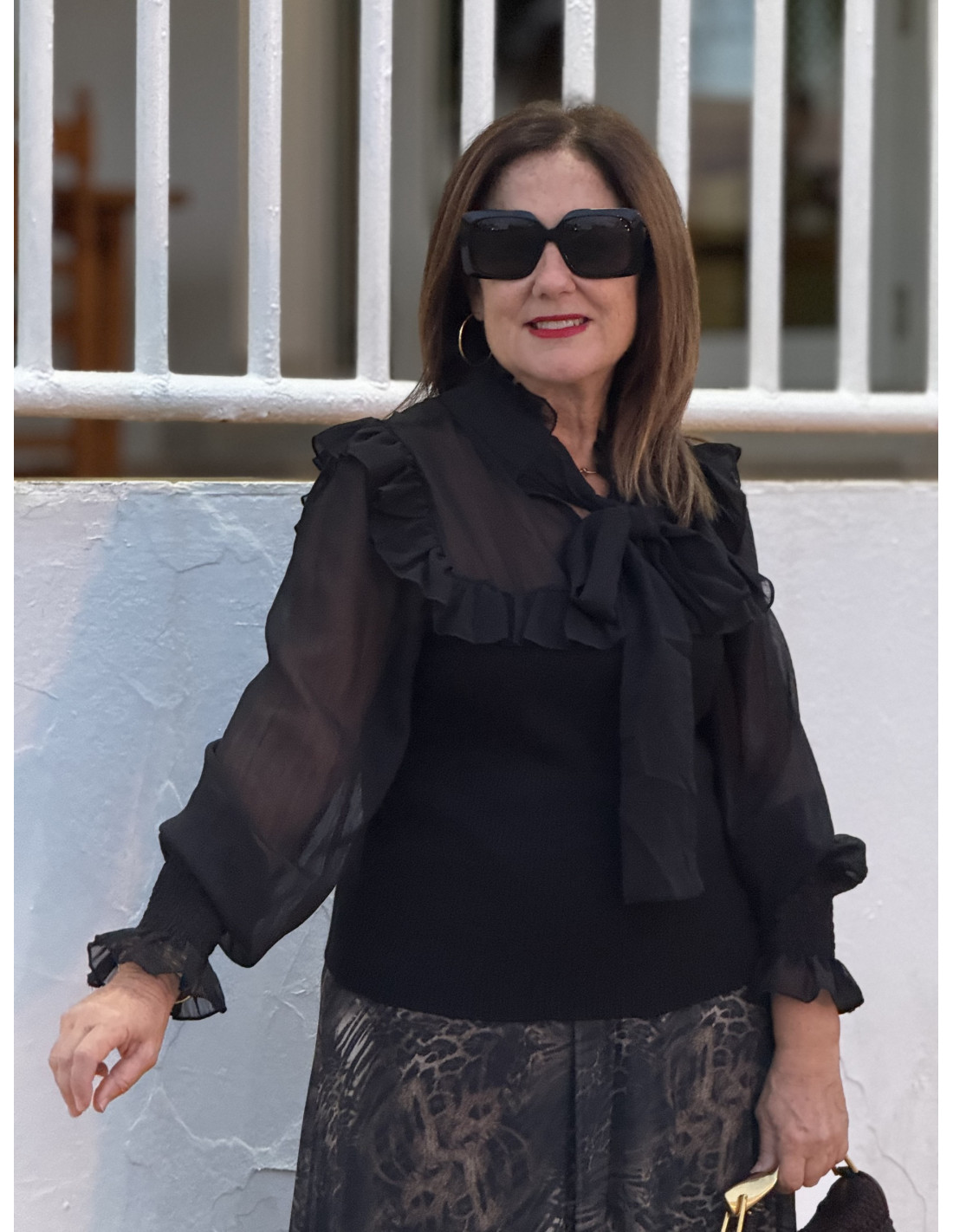 Este suéter en color negro destaca por su diseño versátil y su mezcla de texturas. La parte del cuerpo, confeccionada en canalé elástico, se adapta suavemente a la silueta, mientras que la gasa fluida en mangas y parte superior le da un toque romántico y sofisticado.