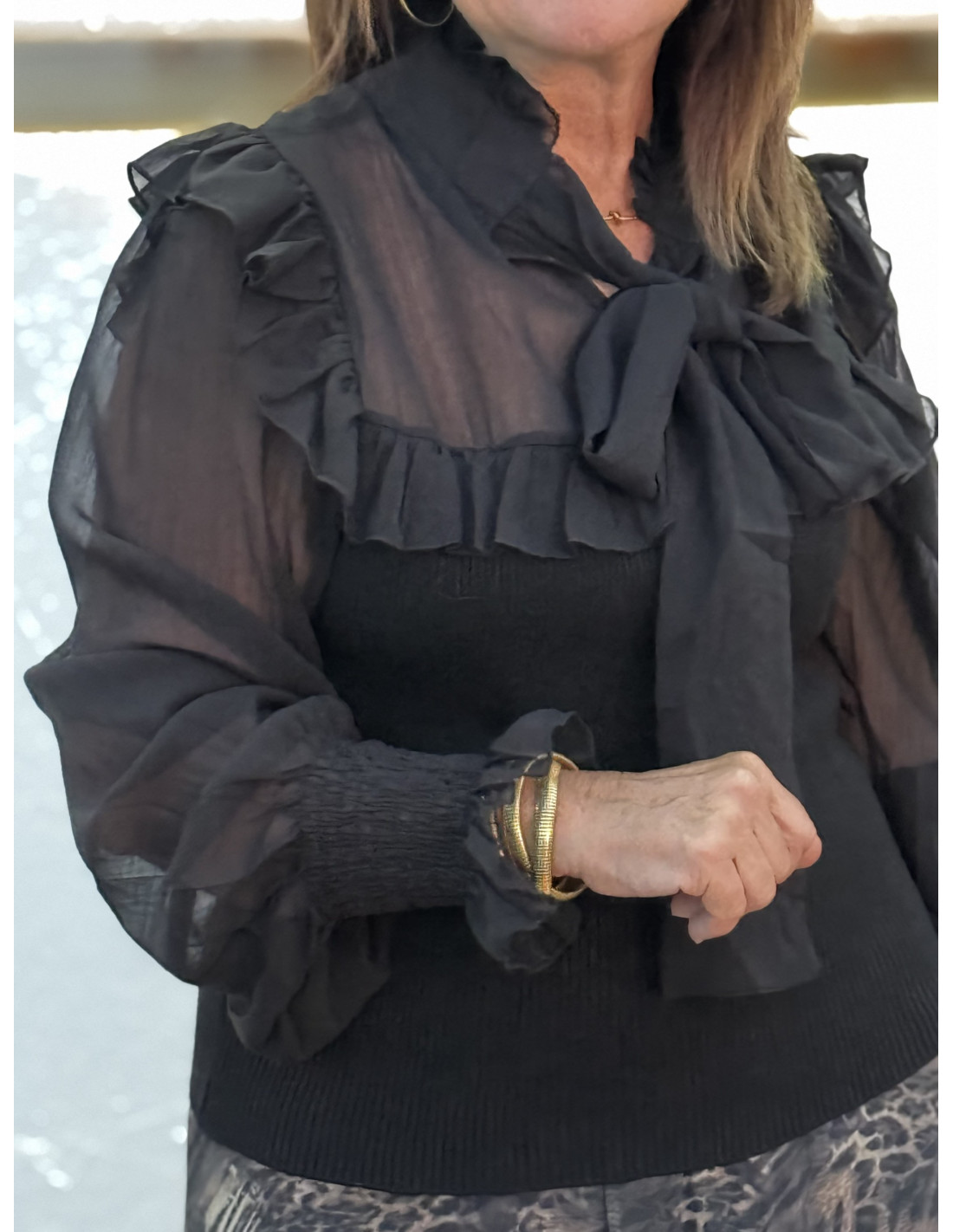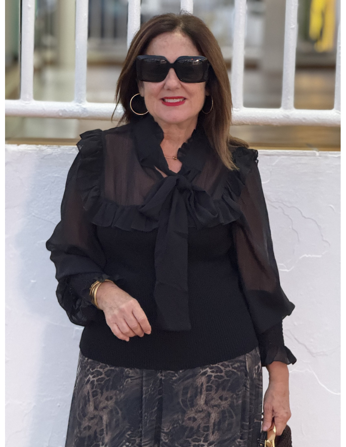 Suéter combinado en canalé y gasa en tono negro. La parte inferior de punto elástico se ajusta cómodamente a la figura, mientras que la parte superior y las mangas de gasa aportan ligereza y elegancia. Se puede llevar con la lazada hacia delante o hacia atrás, ofreciendo dos estilos en una sola prenda.