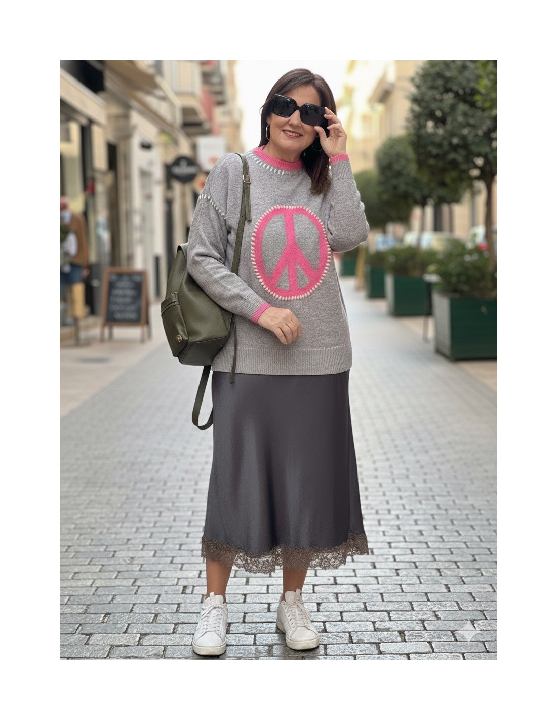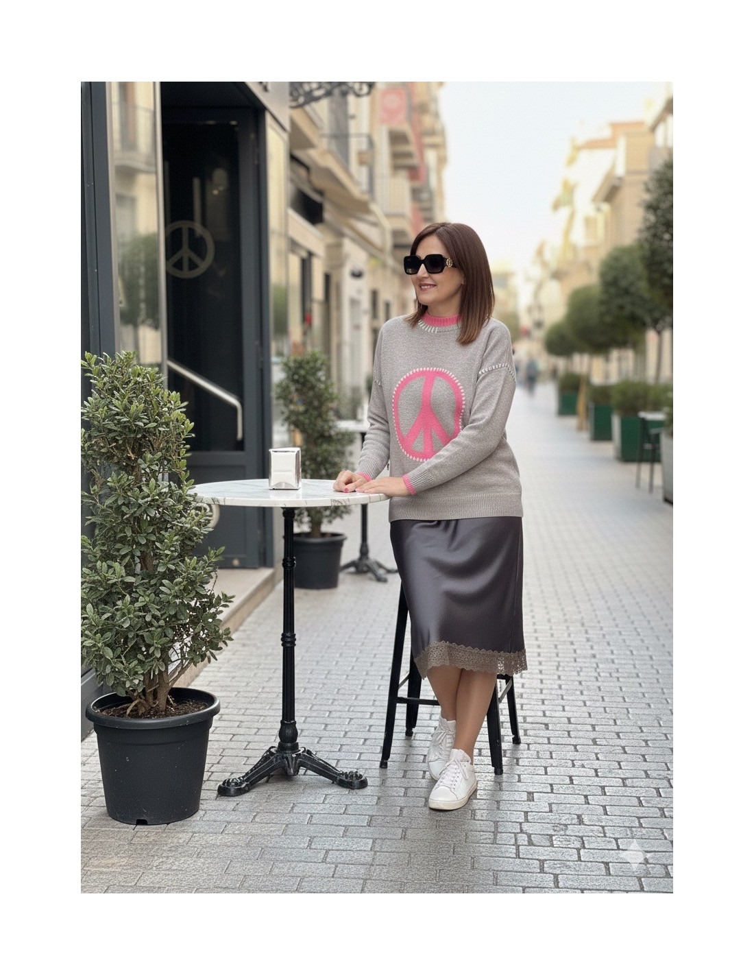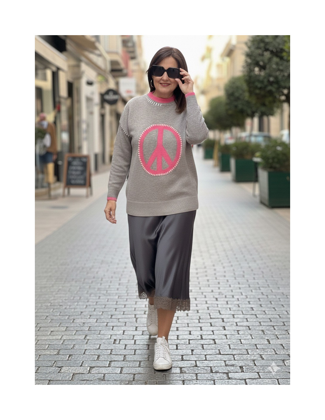 Suéter gris con símbolo de la paz en rosa
