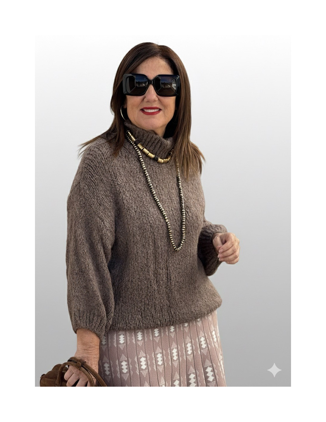Suéter de lana punto gordo con cuello tortuga marrón
