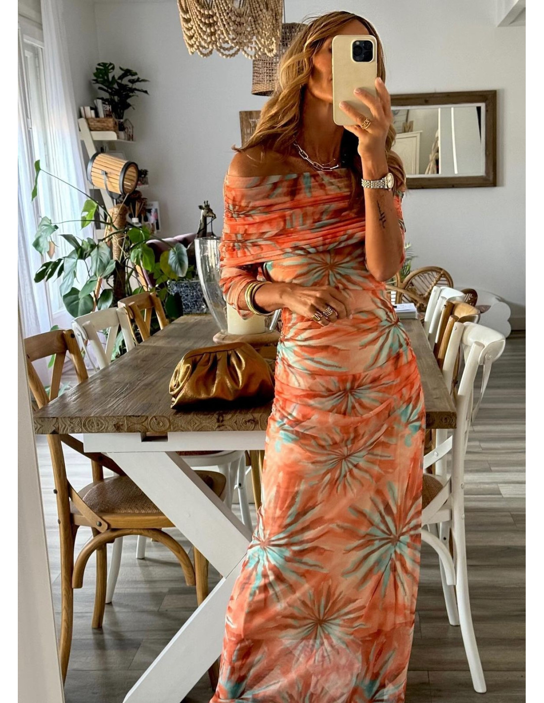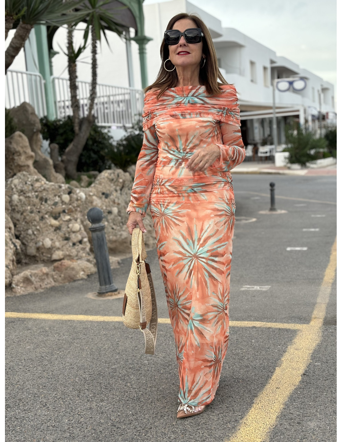 Deslúmbrate con nuestro vestido Bardot de tul en tonos naranjas y estampado. Cuello Bardot con forro incorporado. ¡Favorecedor y lleno de estilo!