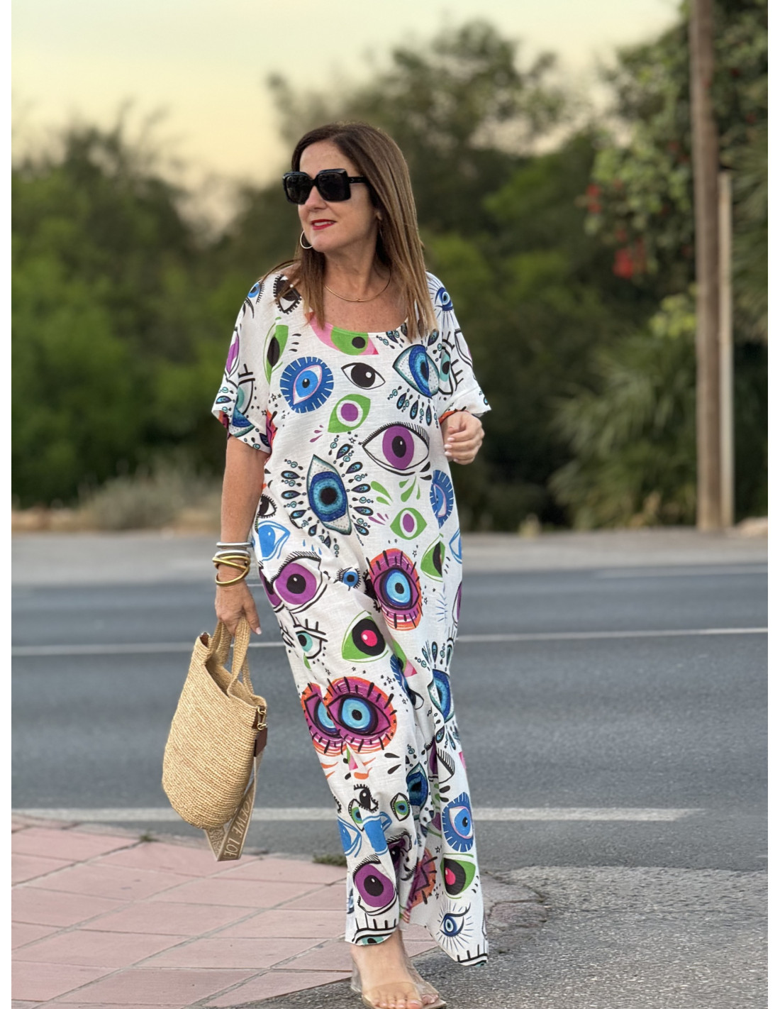 Vestido de lino blanco con estampado de ojos multicolores y abertura lateral.