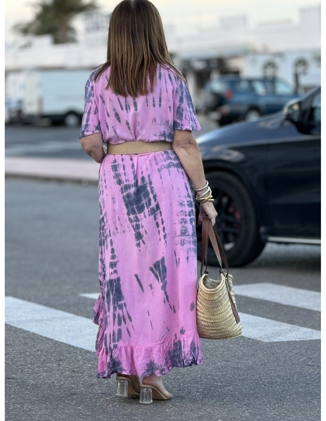 Vestido tie dye en colores rosa y azul, tipo pareo que se anuda en la cintura con abertura frontal.