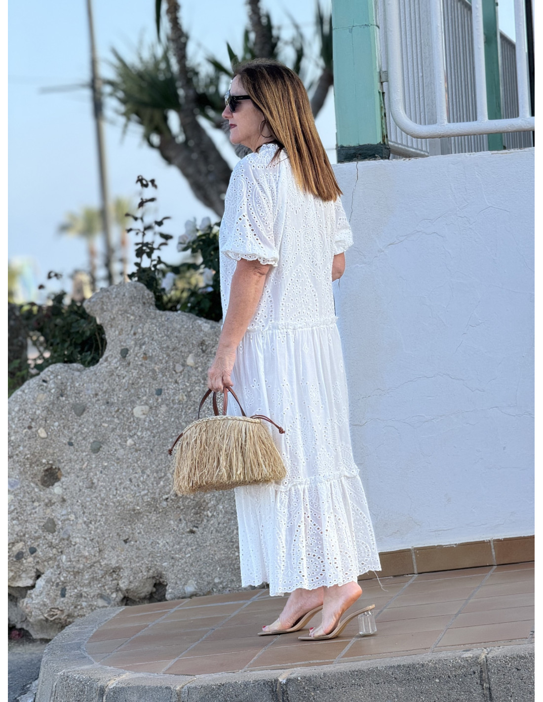 Este vestido blanco en bordado inglés es una pieza encantadora y romántica, perfecta para añadir un toque de elegancia y frescura a tu guardarropa. Con su diseño detallado y cuidadoso, este vestido es ideal para ocasiones especiales y eventos veraniegos.