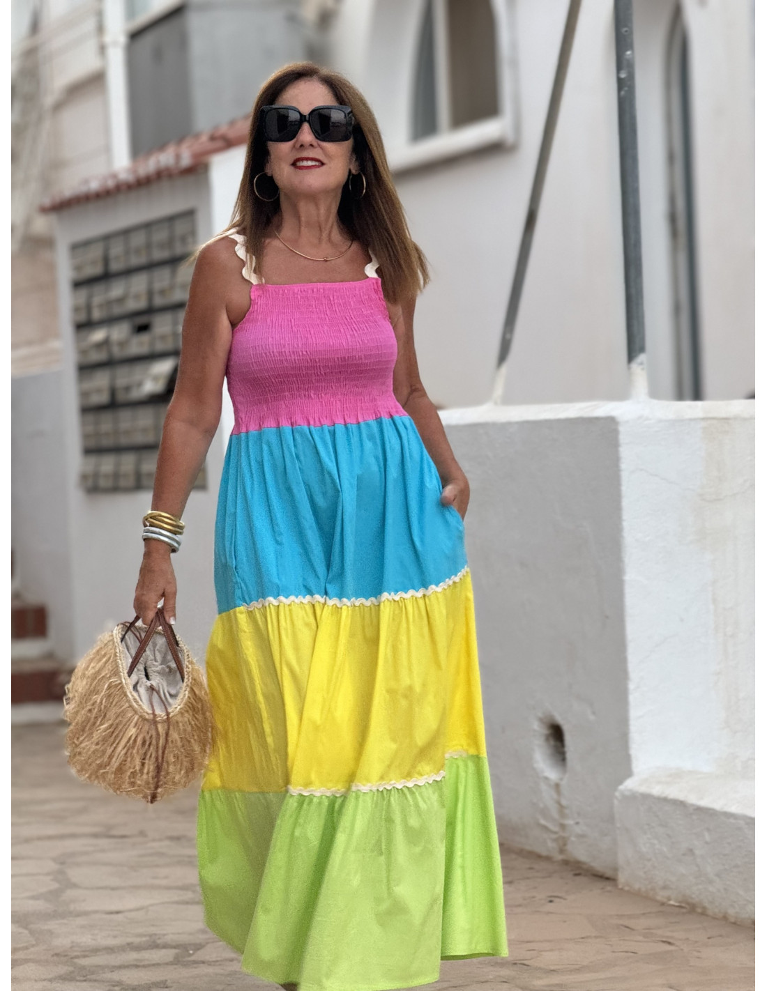 Vestido largo en franjas de colores: verde lima, amarillo, turquesa y rosa. Cuerpo en nido de abeja adaptable y tirantes de piculina cruda.