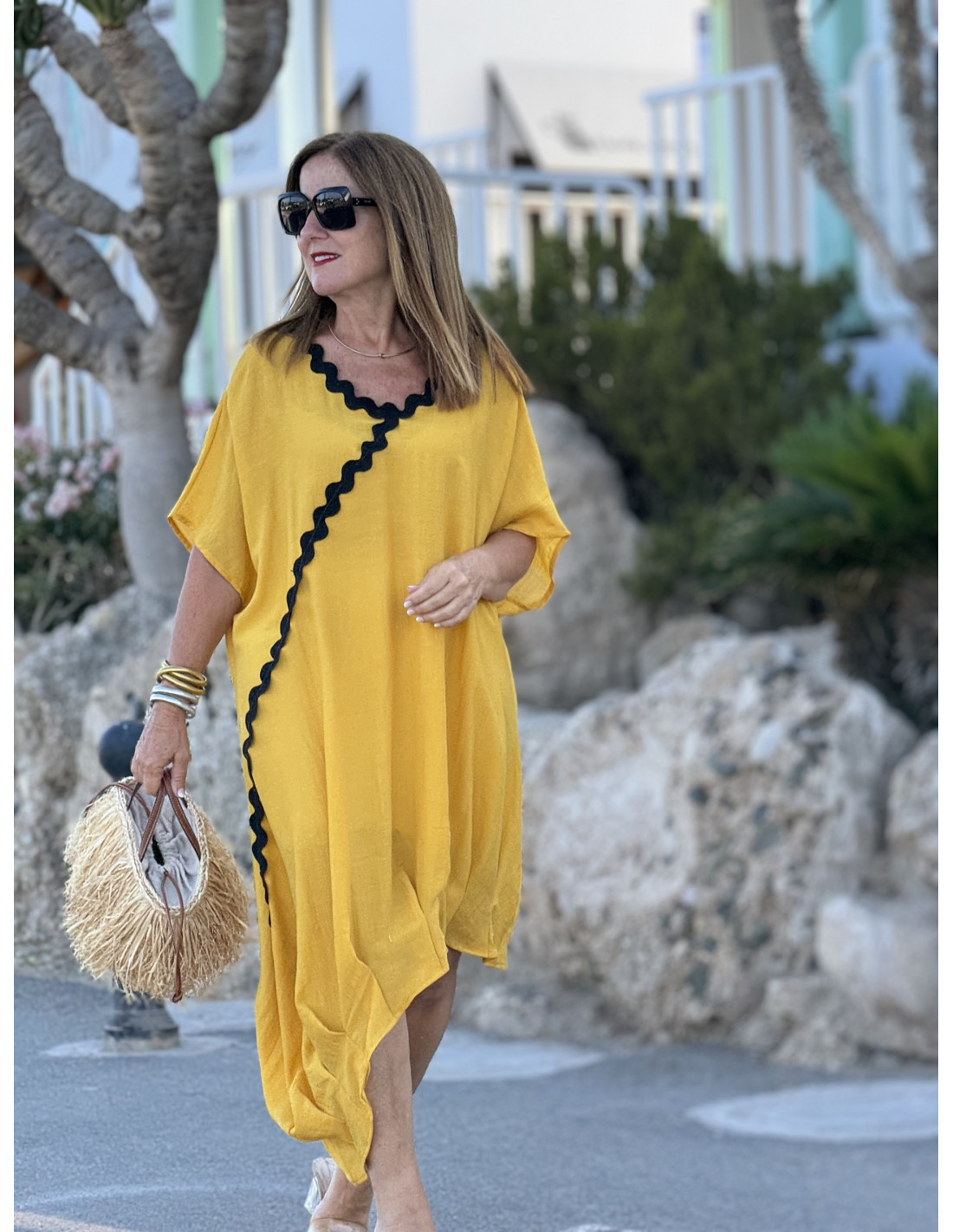 Vestido de lino en color mostaza con corte asimétrico y escote de pico. Adornado con piculina negra y pliegues favorecedores.