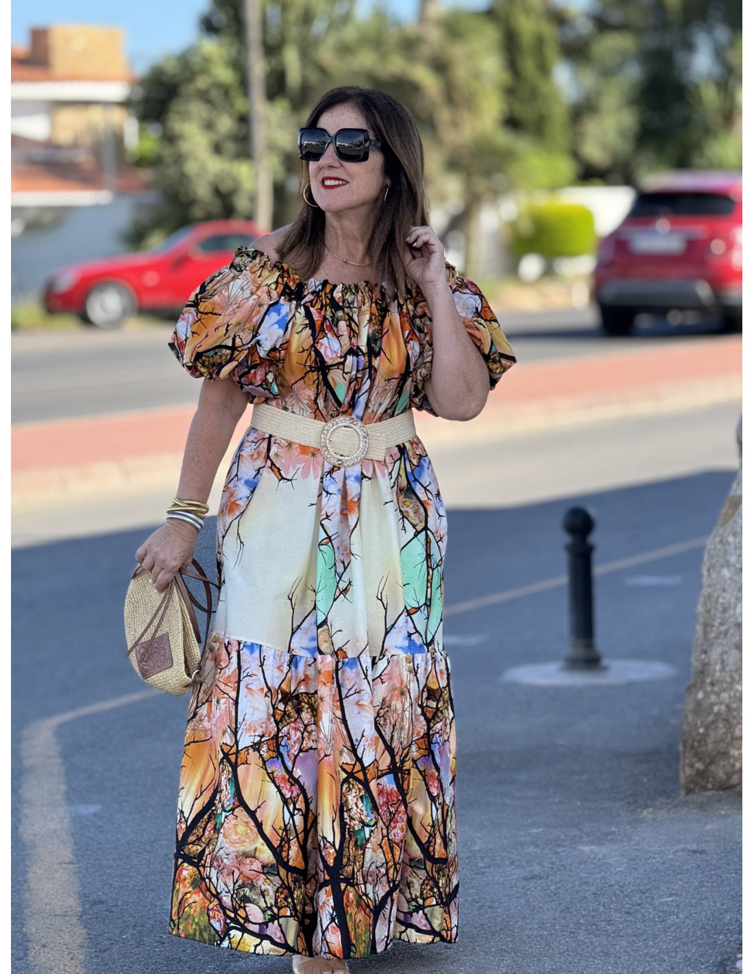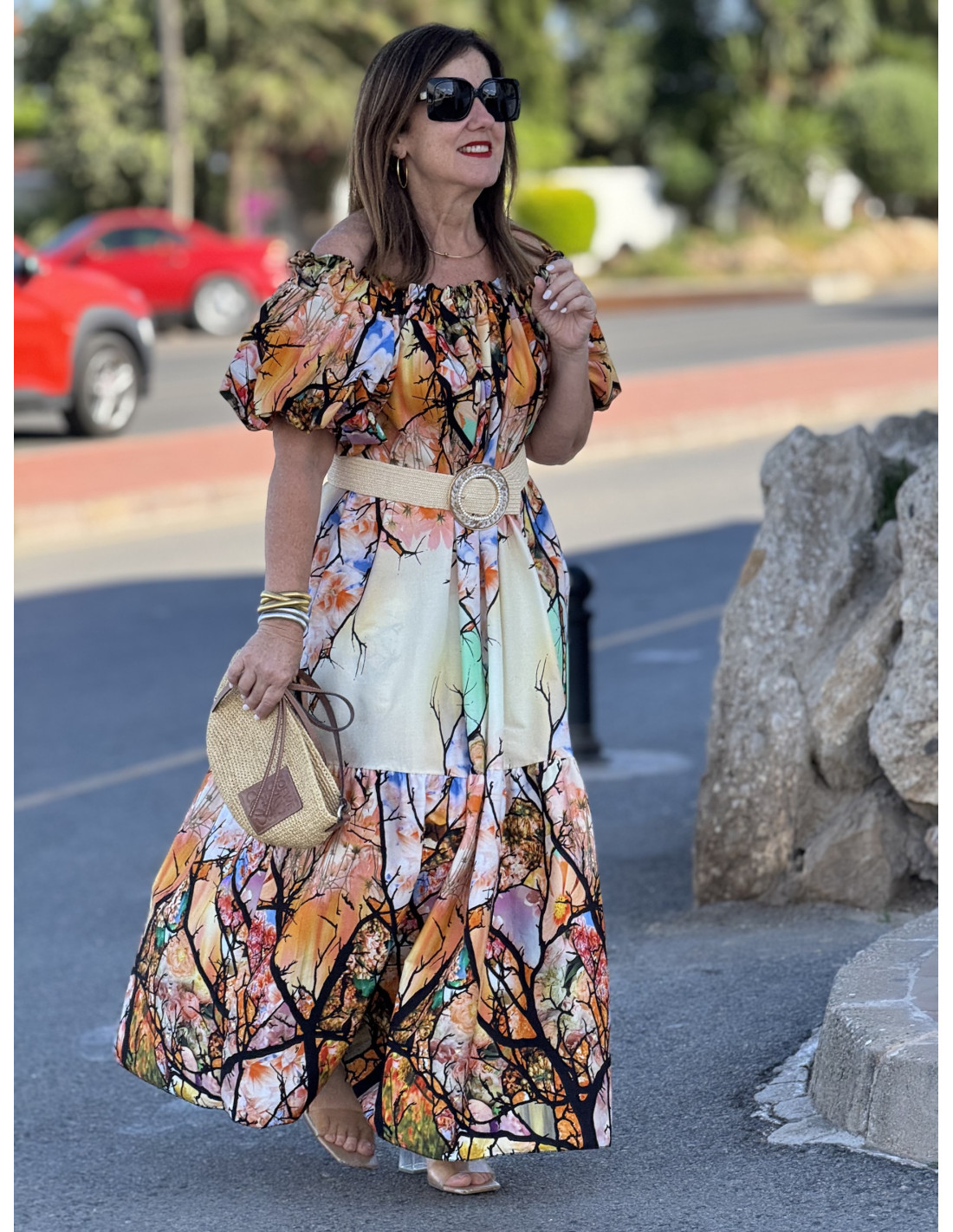 Vestido largo con un estampado floral lleno de color y un diseño muy femenino. Lleva escote elástico para lucir los hombros, mangas abullonadas y bolsillos laterales. Comodidad y estilo en una sola prenda.
