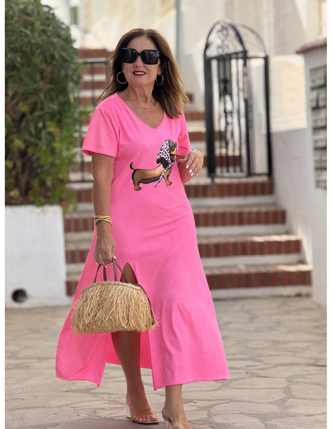 Vestido largo en rosa flúor con efecto lavado, escote pico, abertura lateral y diseño de perro con detalles de abalorios.